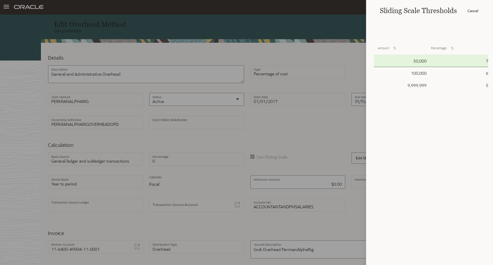 - Joint Venture Management Overhead Method - Percentage of Cost with Sliding Scale Option