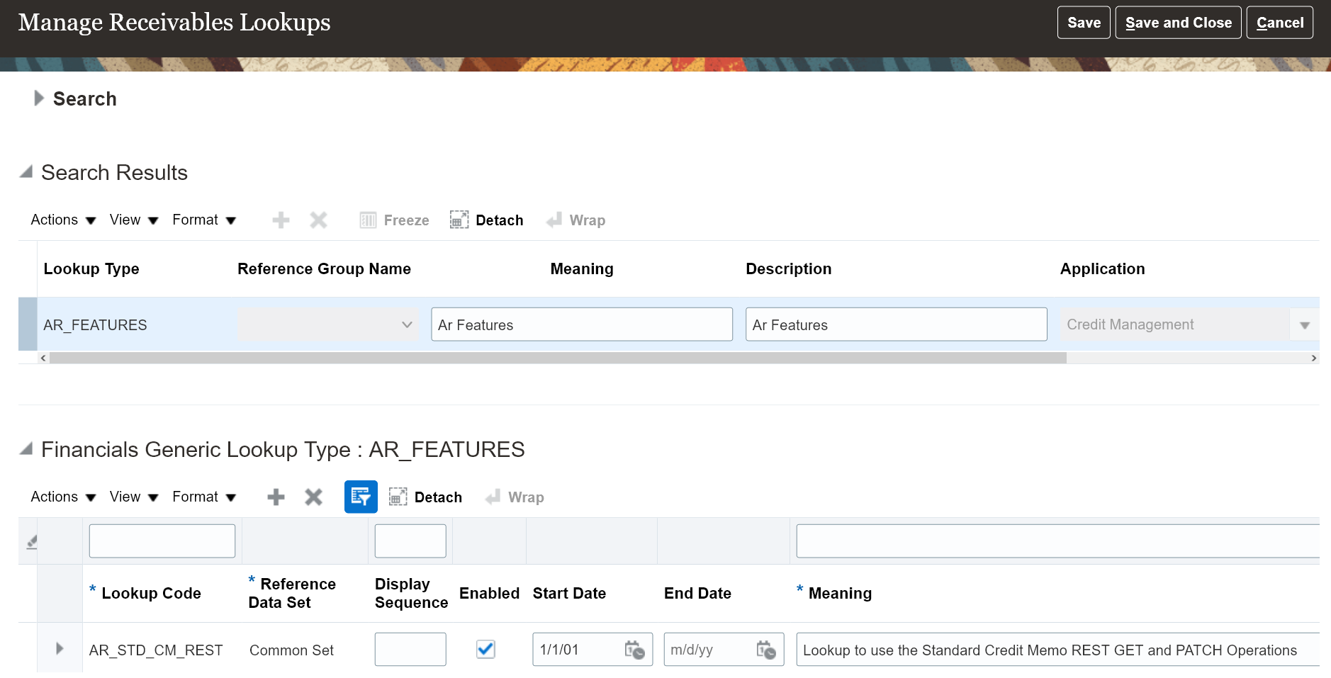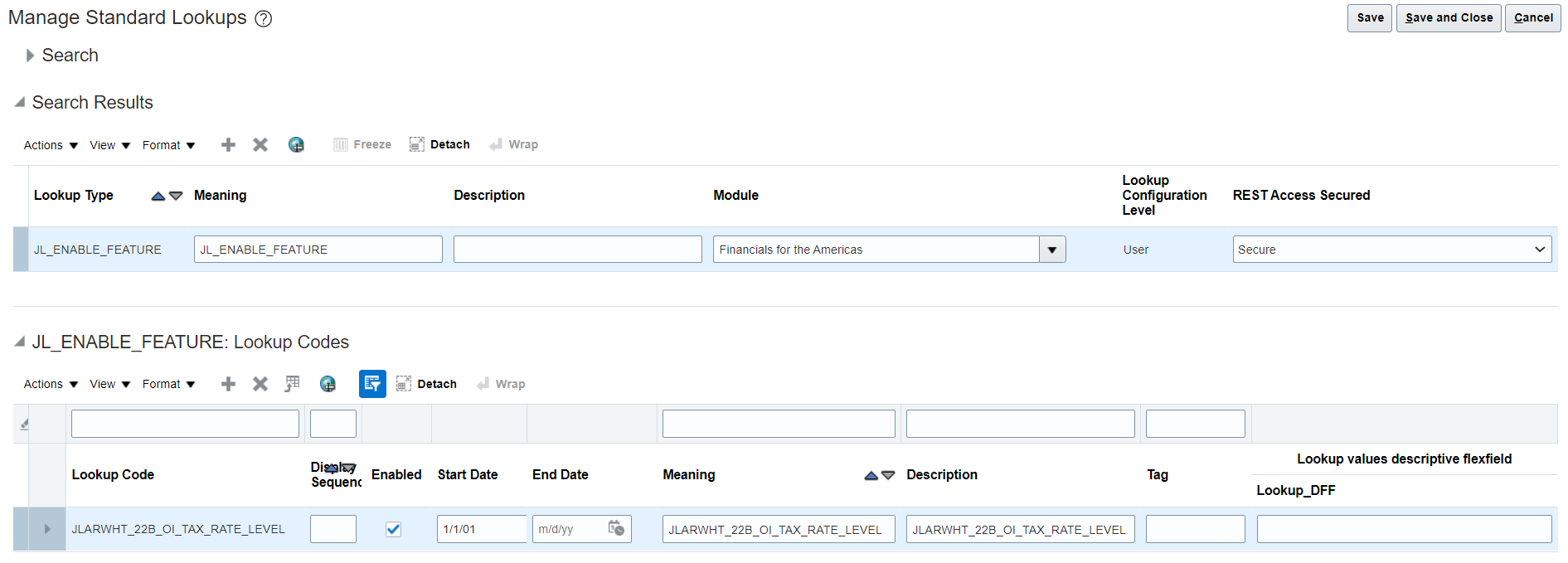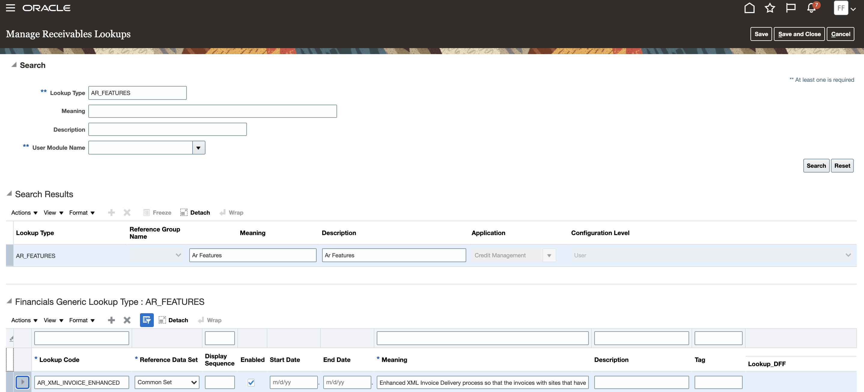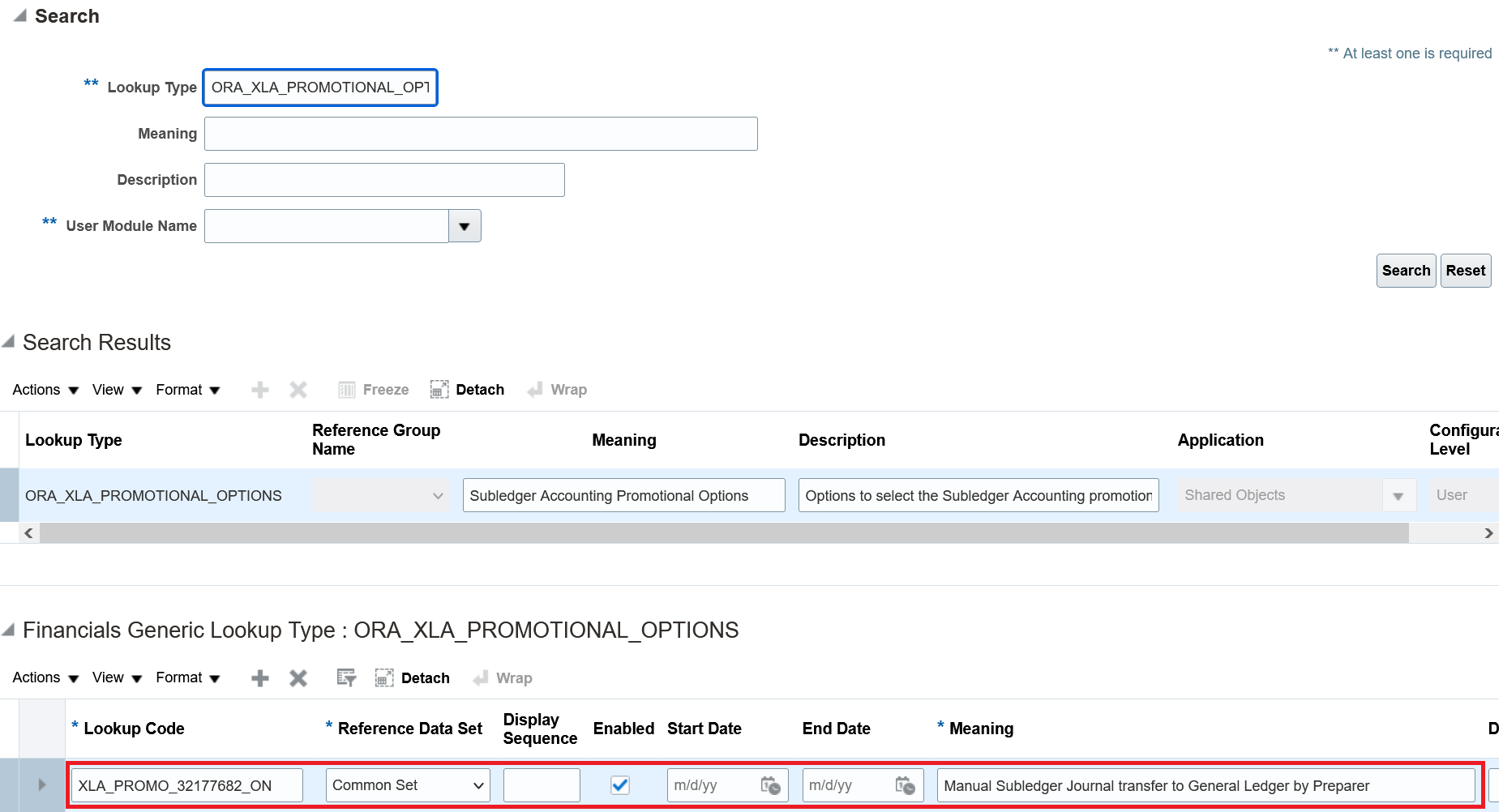 - Search for the lookup type JE_ENABLE_FEATURE. If the lookup type is not defined, create one with below details: