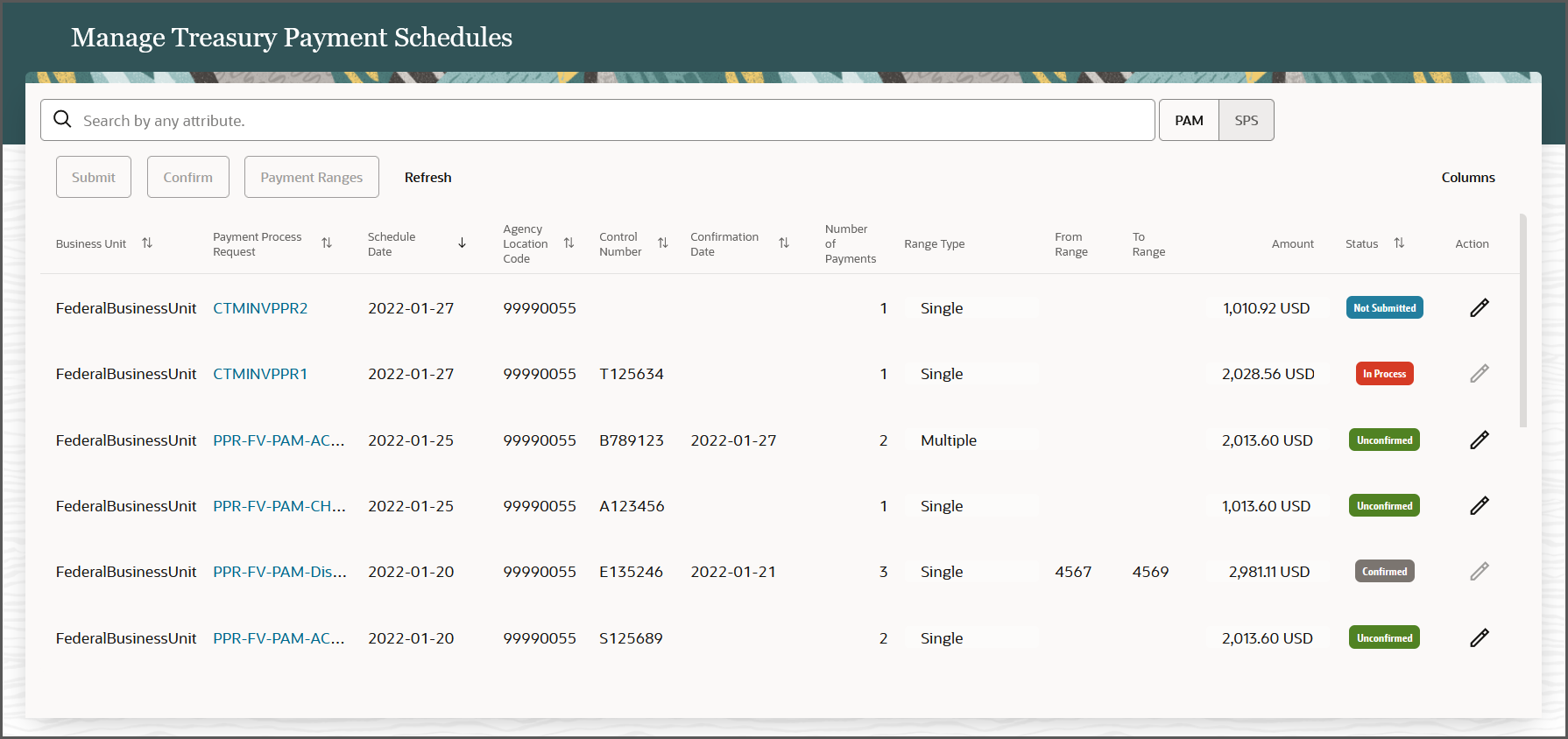 Use the Manage Treasury Payment Schedules page to record Treasury confirmation information such as confirmation date and check number range. When the page is opened, all payment process request (PPR) records that are ready for confirmation and have the Unconfirmed status are automatically displayed. After entering the confirmation date, the payment check range type and numbers, the record is ready to be confirmed. The Treasury Confirmation process is submitted when you click the Submit button. The process changes the status of the PPR to Confirmed. Submit the Create Accounting process to create the corresponding accounting entries for Treasury confirmation.