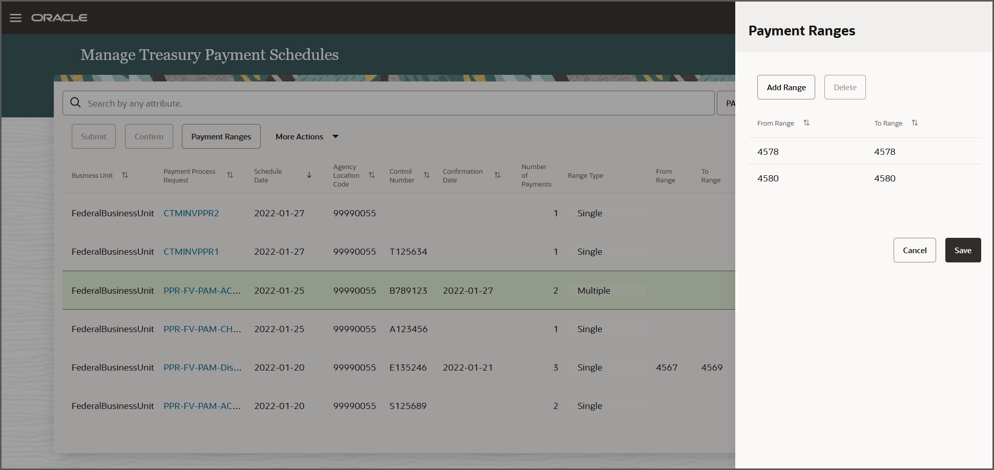 Manage Treasury Payment Schedules Page - Payment Ranges