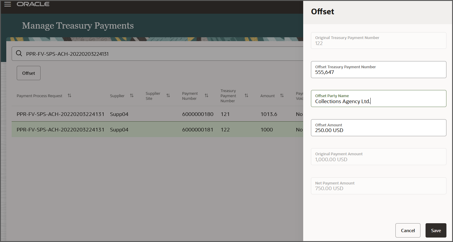 If you need to record an offset amount against a payment, you can enter the offset amount by using the Offset button on the Manage Treasury Payments page. To create an offset against the payment, enter the offset Treasury payment number, the name of the offset party, and the offset amount. The net payment amount is automatically calculated based on the difference of the original payment amount and the offset amount.
