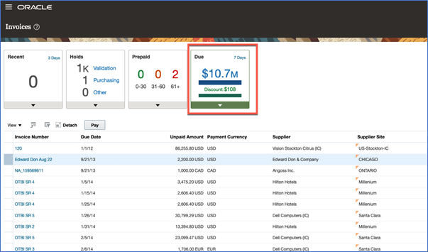 The Payment infotile on the Invoices landing page displays the total amount due for payment by the currency. Clicking the amount displays the invoices due in the subsequent table. The Payment infotile will no longer be available from update 22C onwards. However, you can still retrieve the information from the Payment infotile using the suggested alternatives.
