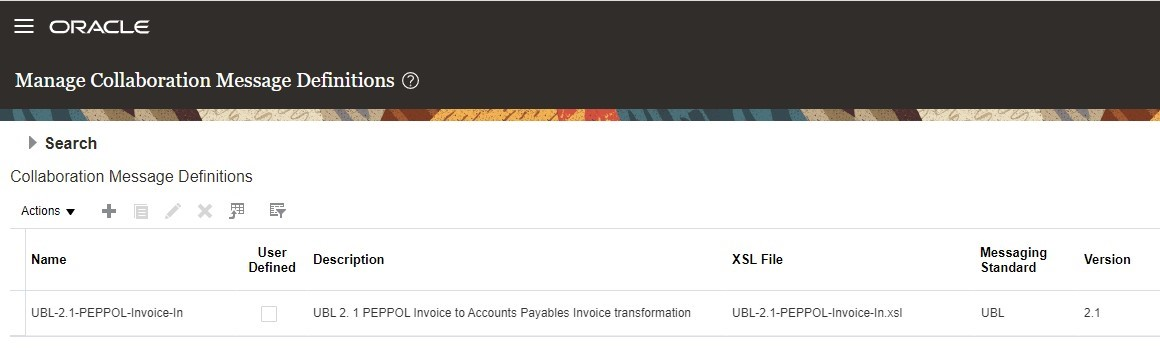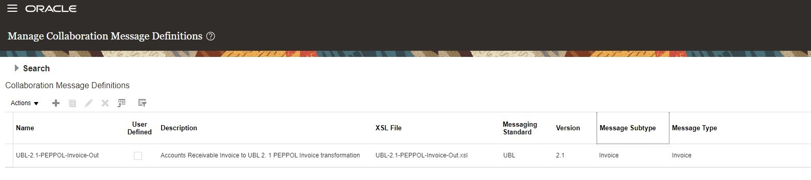 Set up these message definitions as outbound and inbound collaboration messages for a trading partner. Associate the trading partner and the invoice outbound document with a customer by using the Manage Customer Account Collaboration Configuration task. Associate the trading partner and invoice inbound document with a supplier by using the Manage Supplier B2B Configuration task in the Collaboration Messaging work area.