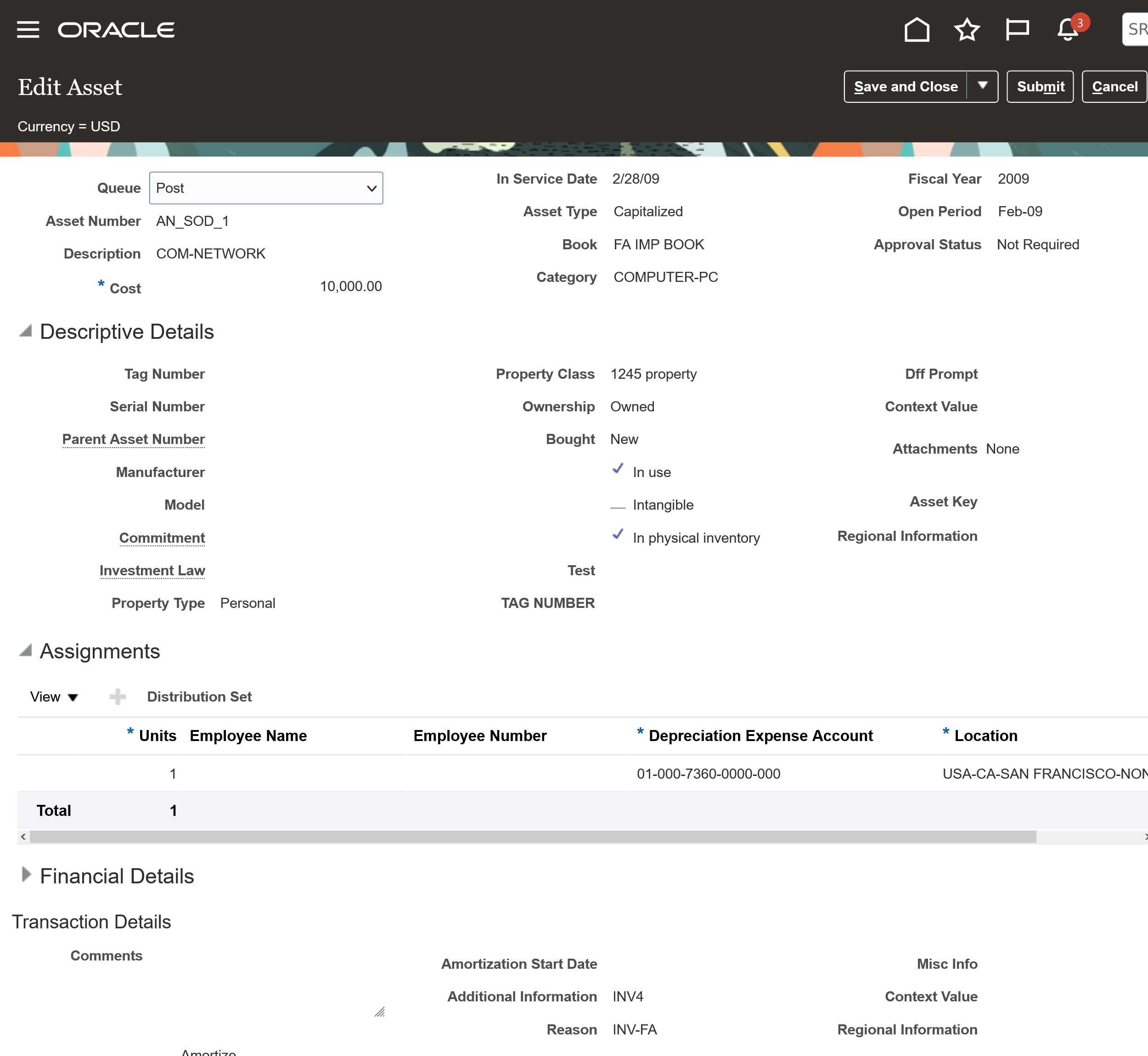 - Refer to Segregation of Transaction Entry and Posting Duties in the Implementing Assets guide on Oracle Help Center.