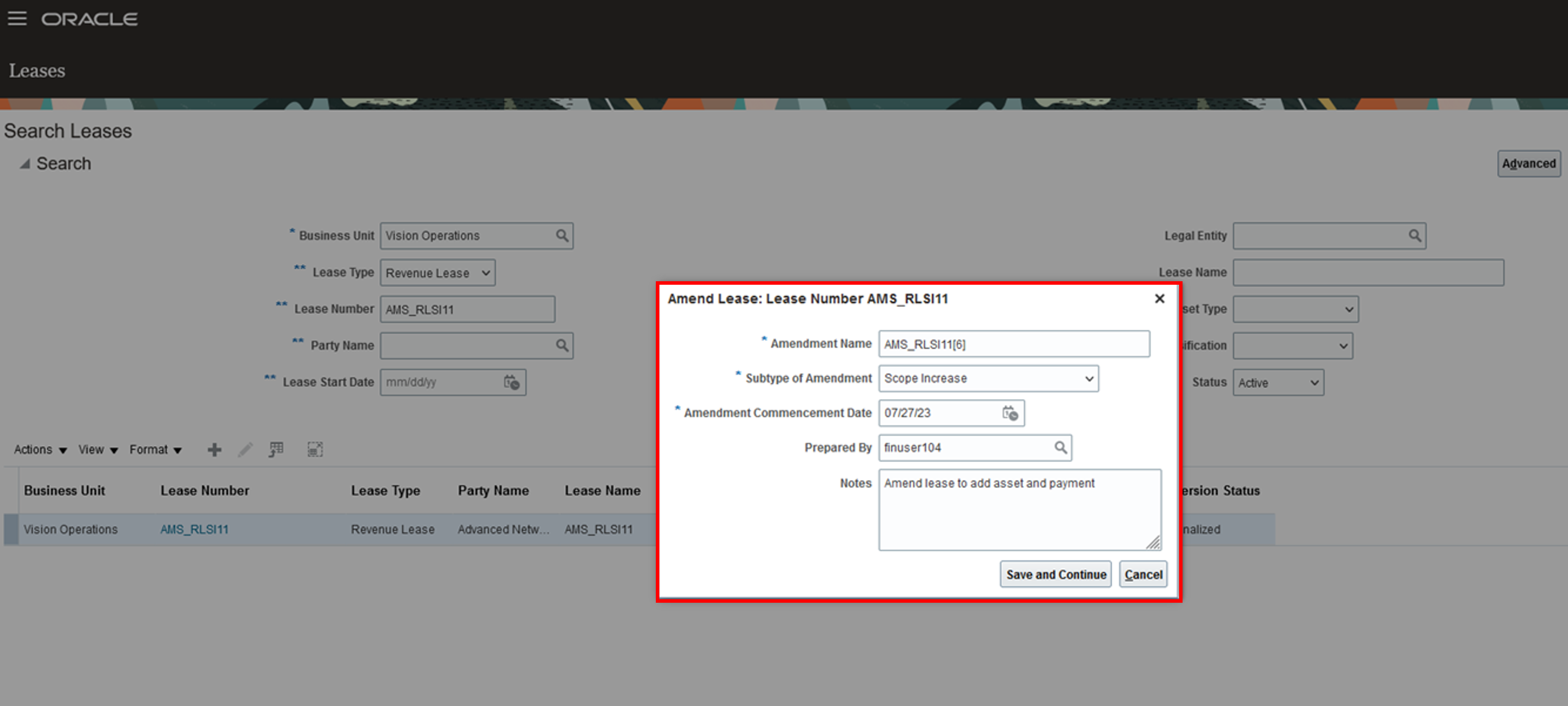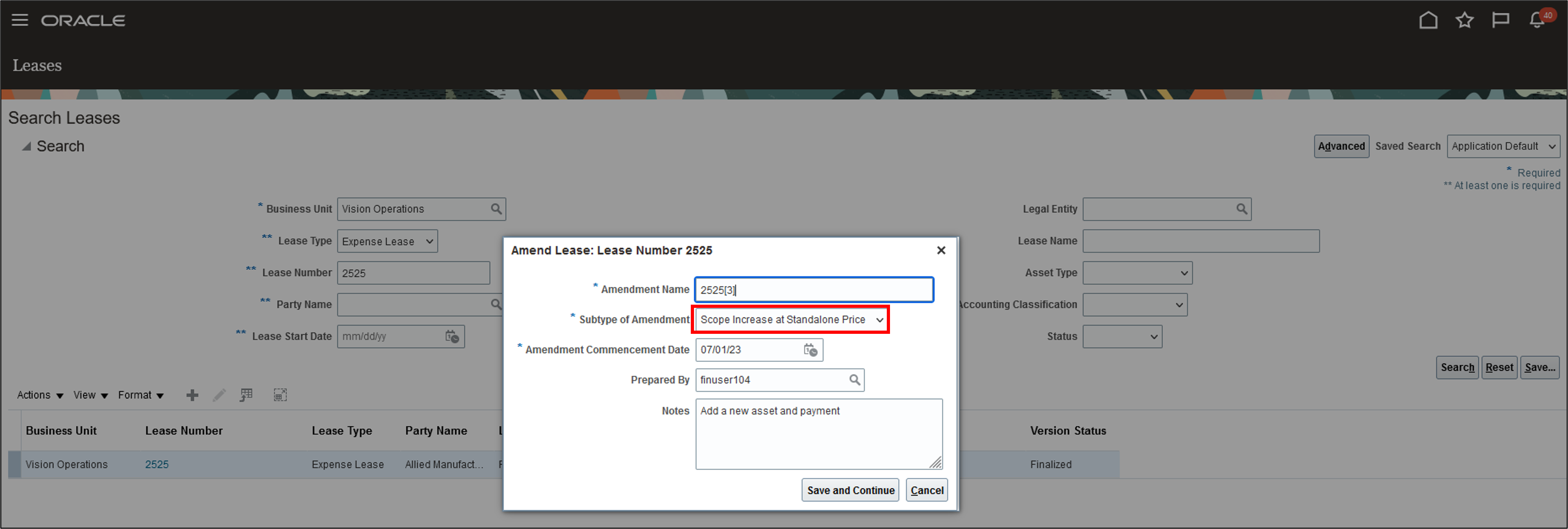 The following screenshots describe the process of amending a lease to account for scope increase at the standalone price.