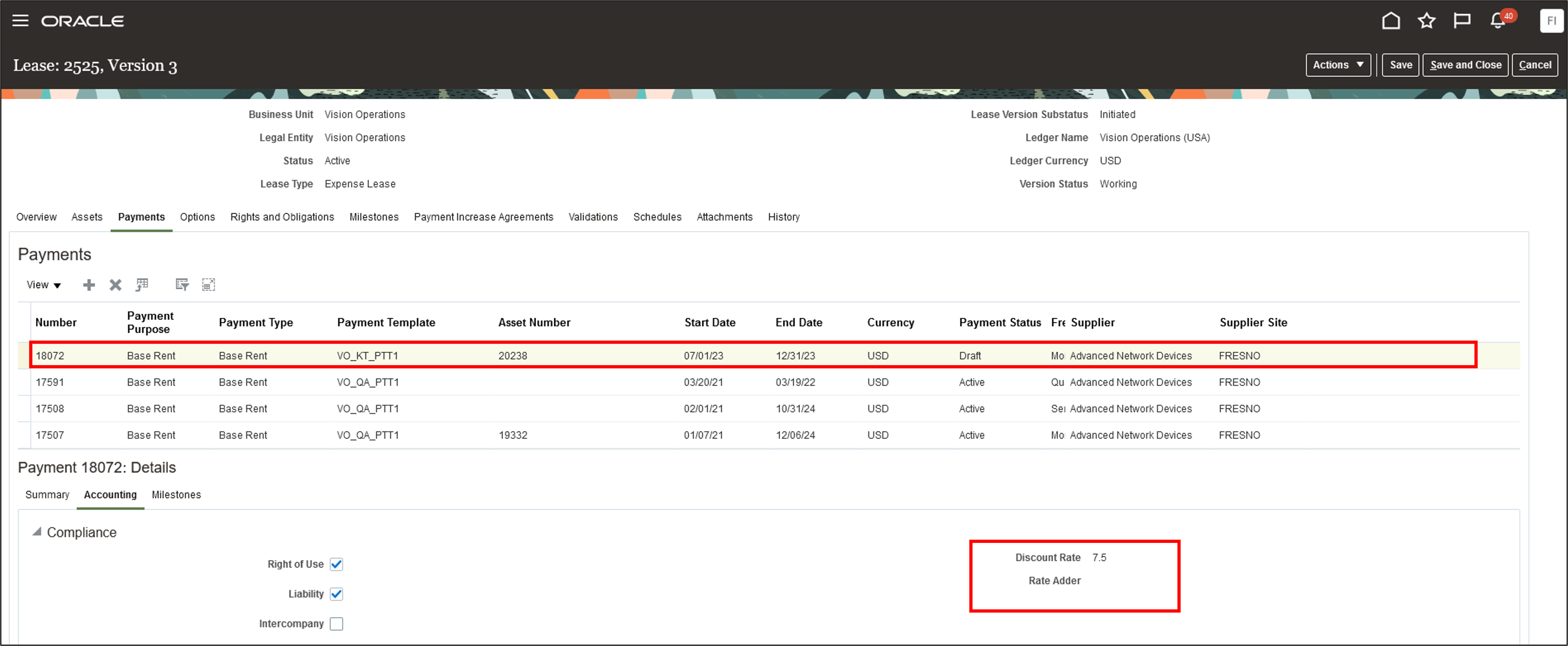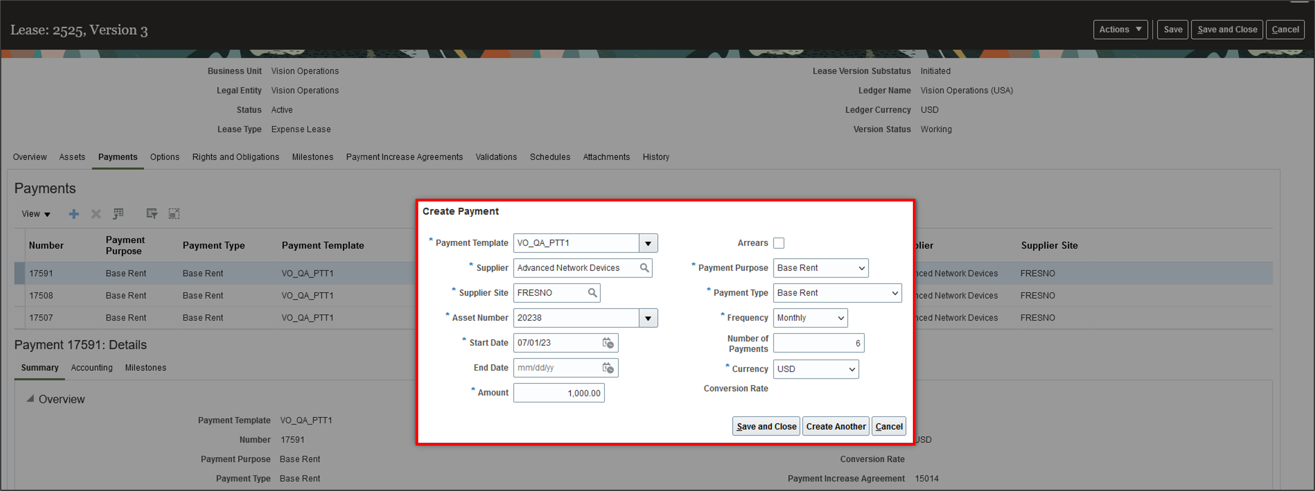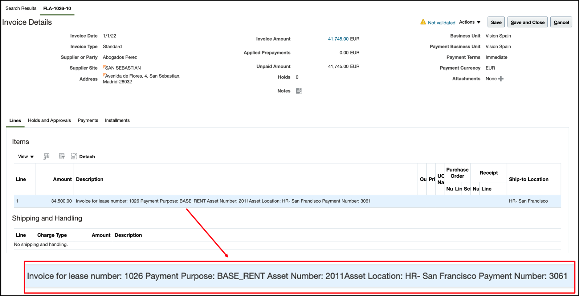 Assign lease, asset, and payment details such as lease number, payment number and purpose, asset number, and location to invoice line descriptions for expense lease invoices created in Payables. Users can view the lease, asset, and payment details on invoice line descriptions in Payables as shown below.