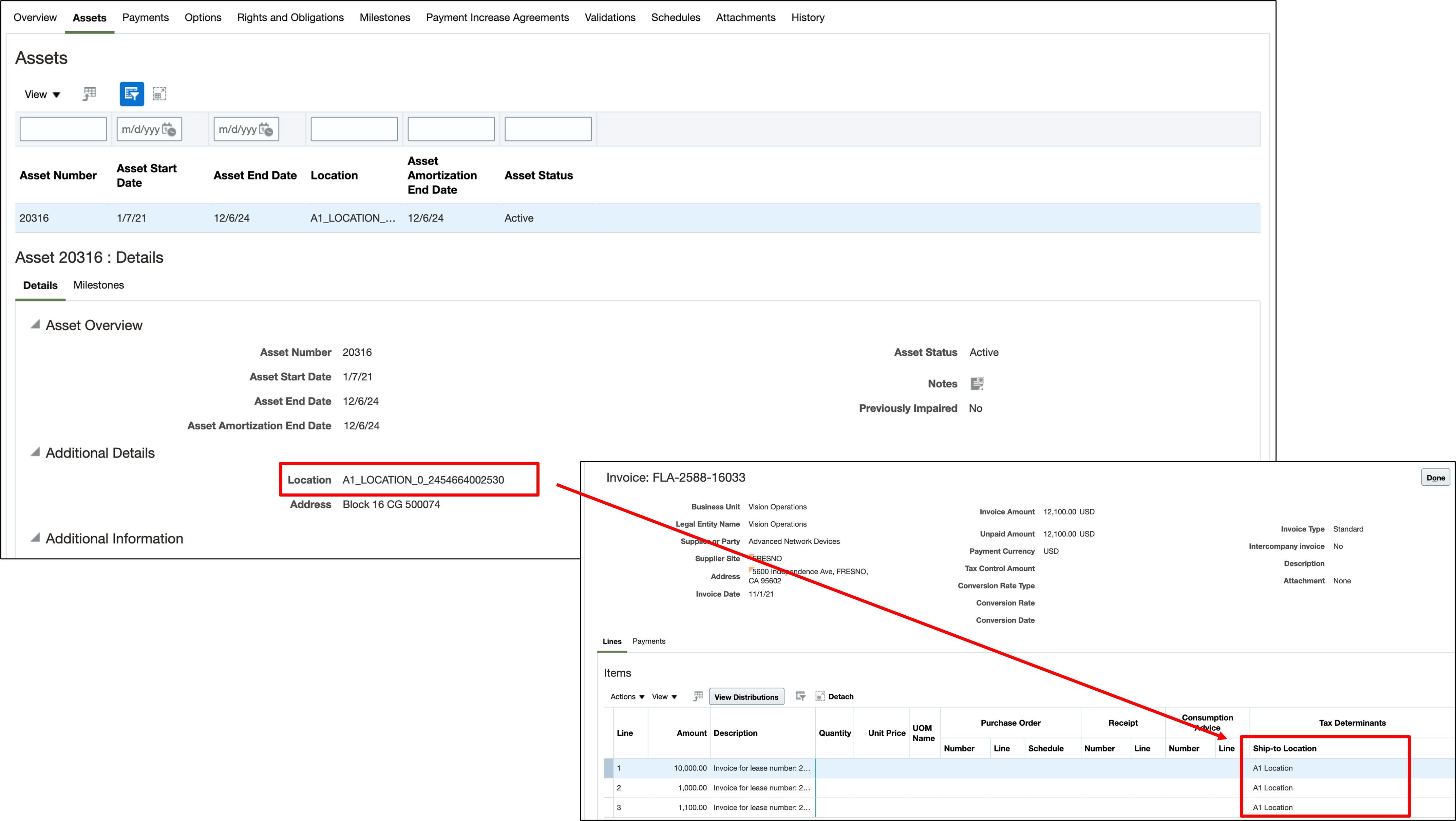 Assign ship-to locations to expense lease invoices created in Payables for periodic payments to lessors and other parties associated with leases.The asset location from the lease will be interfaced to Payables as the invoice line ship-to location for payments associated to the asset. Payments defined at lease level will continue to have the invoice line ship-to location derived from supplier site setups in Payables.