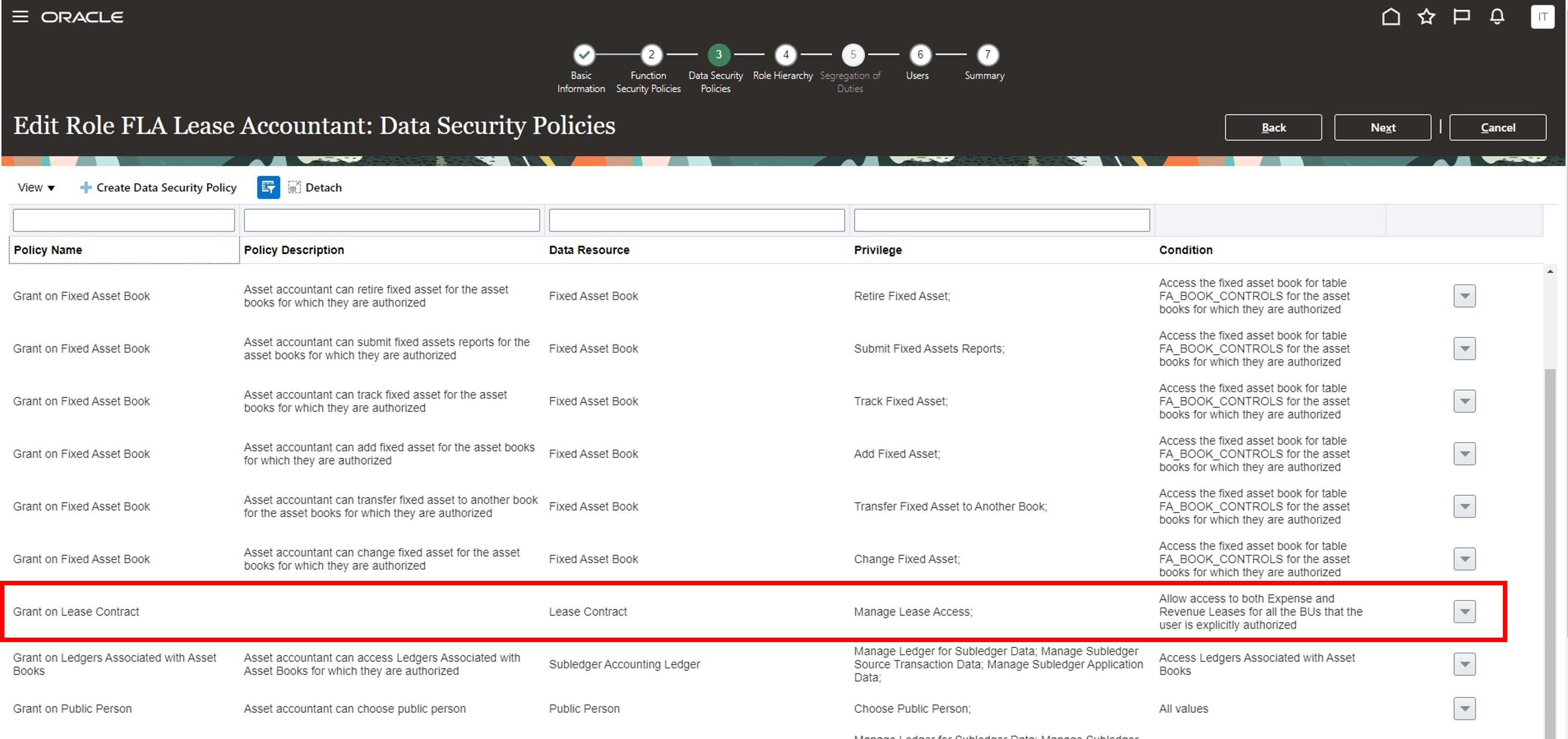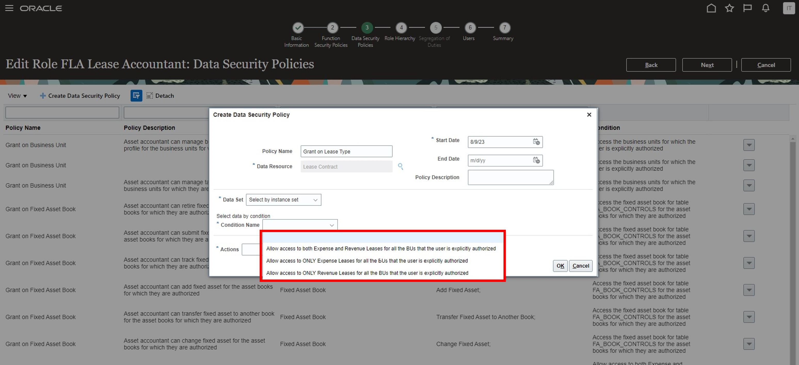 The following screenshots describe creating a data security policy to manage access to lease contracts based on the lease type.