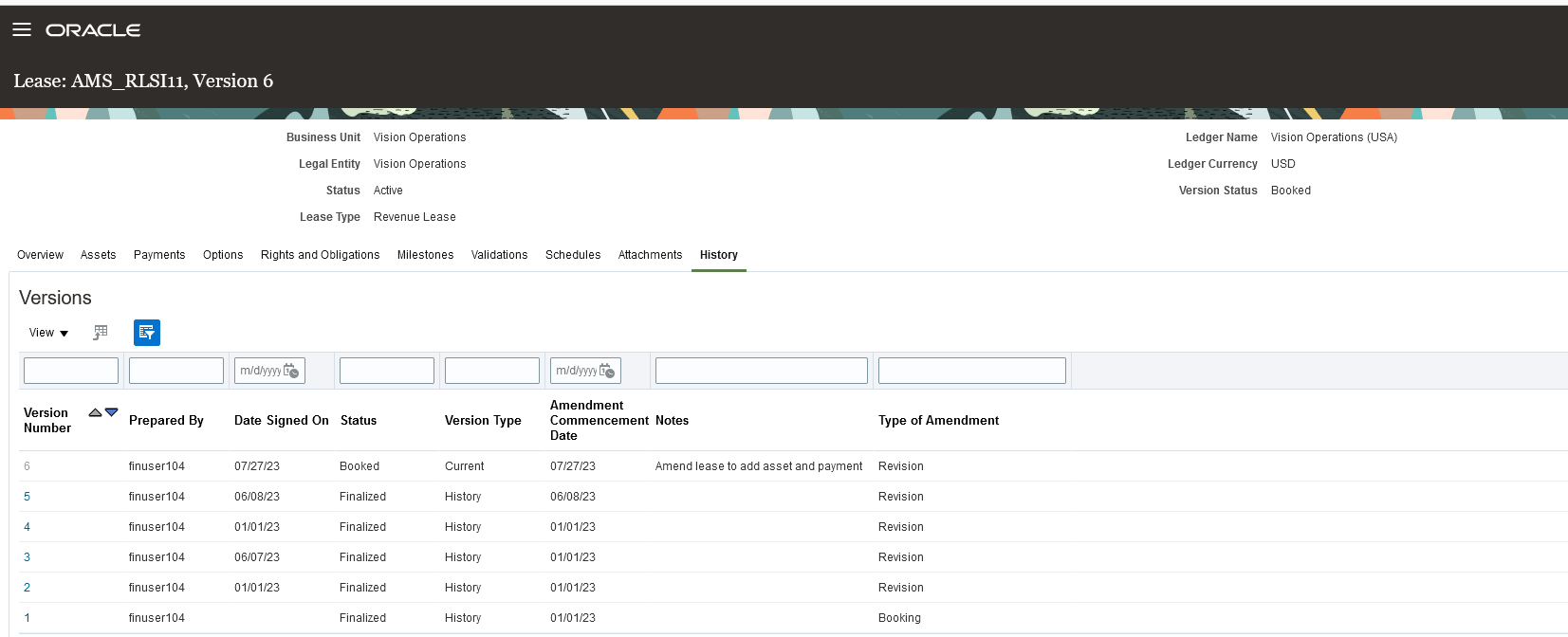 The following screenshots describe creating an amendment for a revenue lease contract and viewing the history of past amendments.