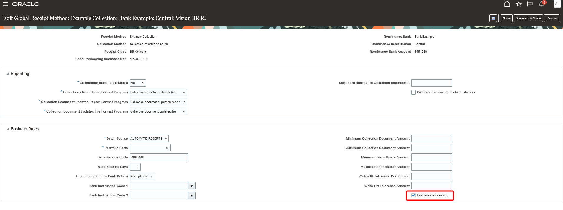 Enable Pix Processing on the Global Receipt Method page to indicate to the bank the collection documents included in a remittance batch will use the hybrid model and will also be processed in the instant payment system.