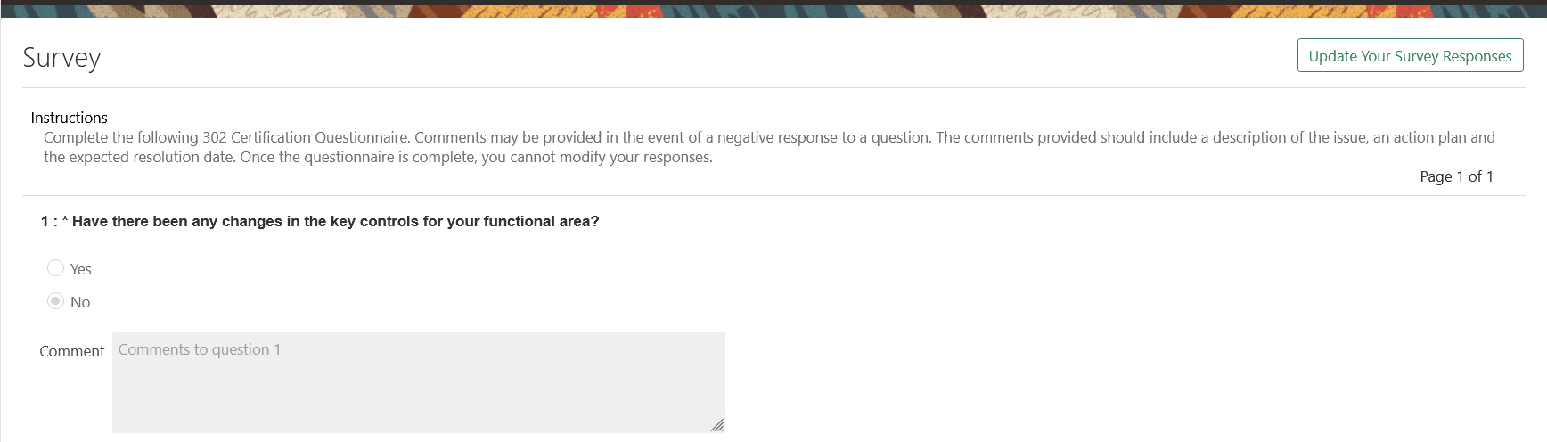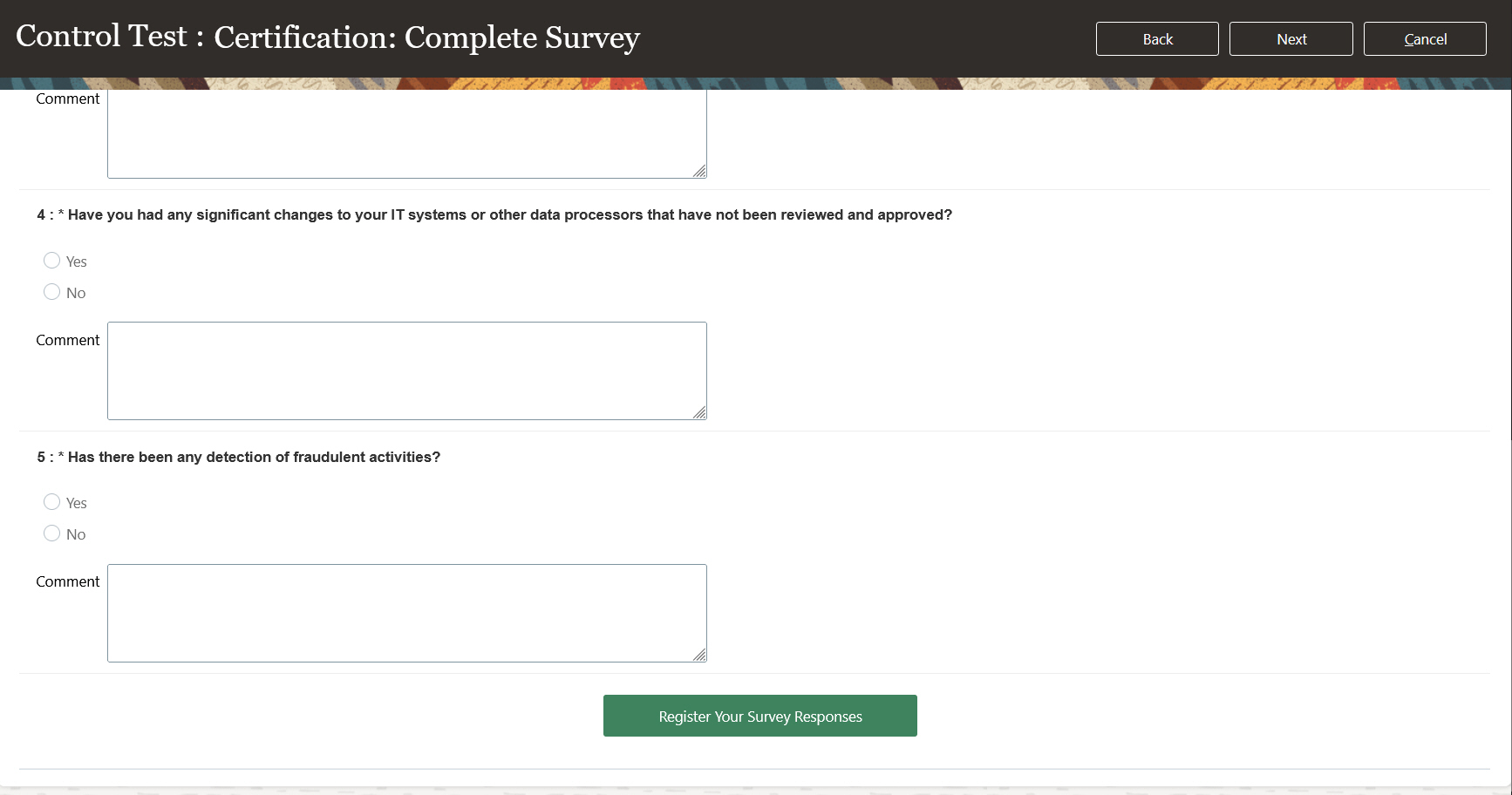 The introduction of the control stratification dimension within the risk details enables you to include the control stratification within the relation to a risk records. The new survey attributes provide additional information pertaining to the survey respondent, which may be required by external auditors. These include a unique respondent ID, which can be the respondent's first name, last name, and email address, as well as the date the respondent submitted responses.