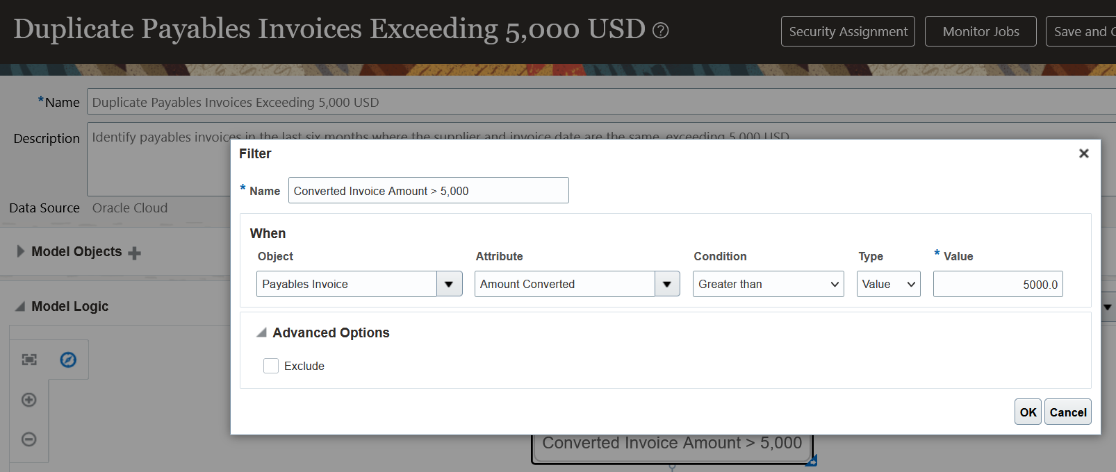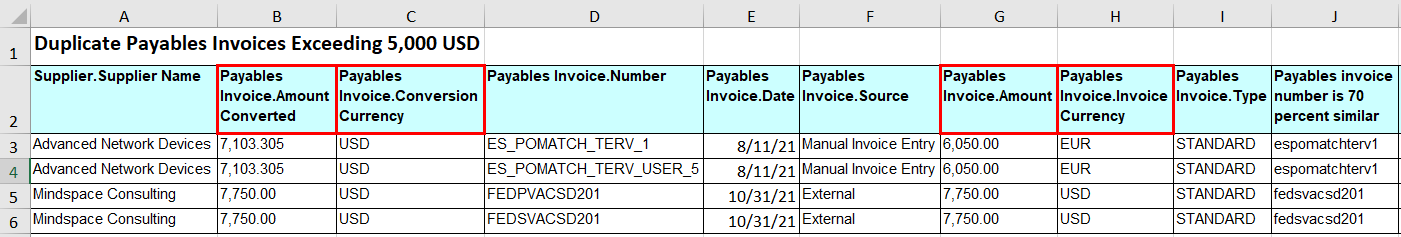 As an example, use the Amount Converted attribute to identify invoice amounts greater than 5,000. In this case, the default To Currency was set to USD, and the calculated values are expressed in that currency.