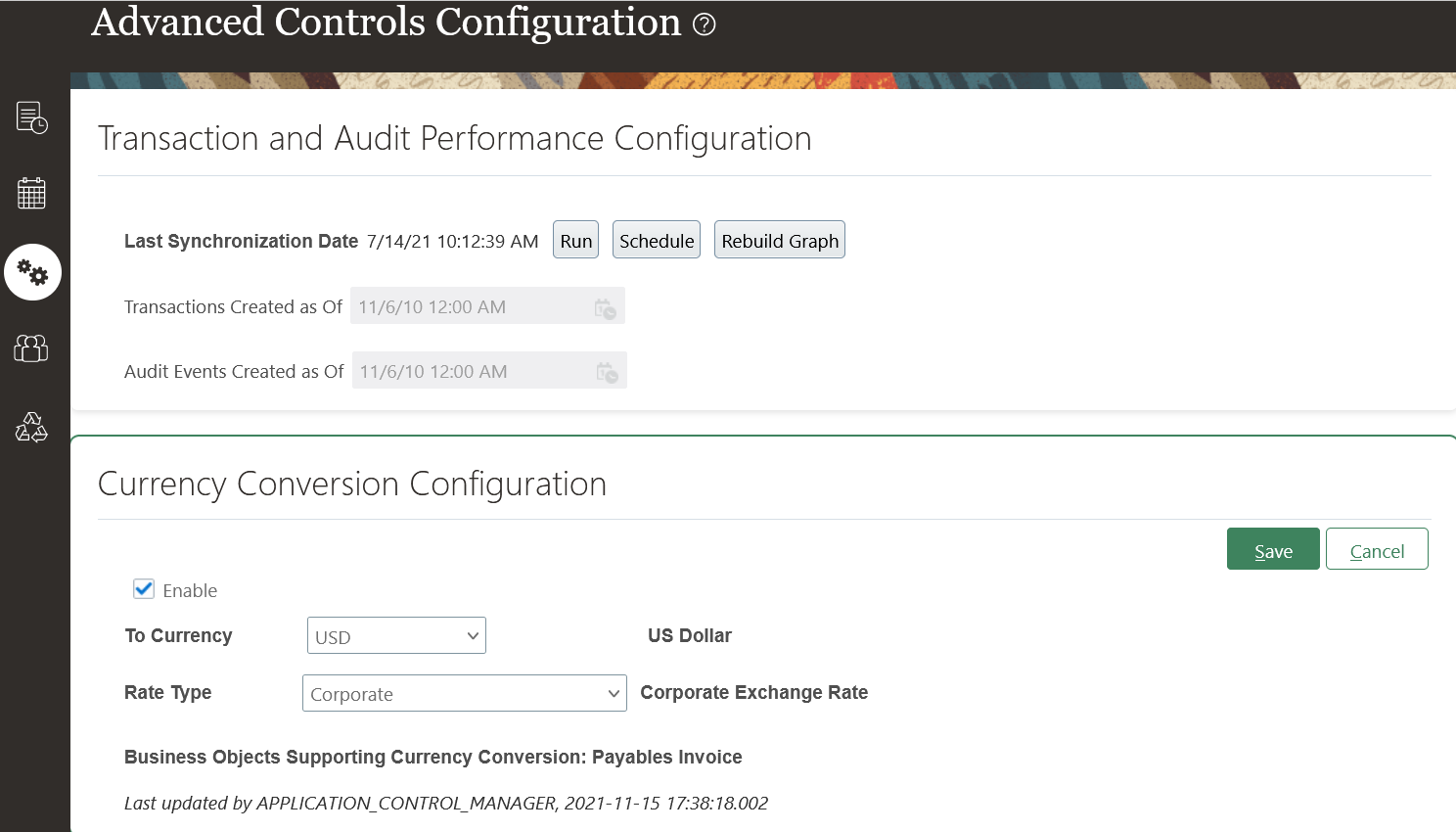 To use and populate currency conversion attribute values in the Payables Invoice business object, you must first perform some setup, since the feature is disabled by default. On the Advanced Controls Configuration page, you will find a new region called Currency Conversion Configuration.