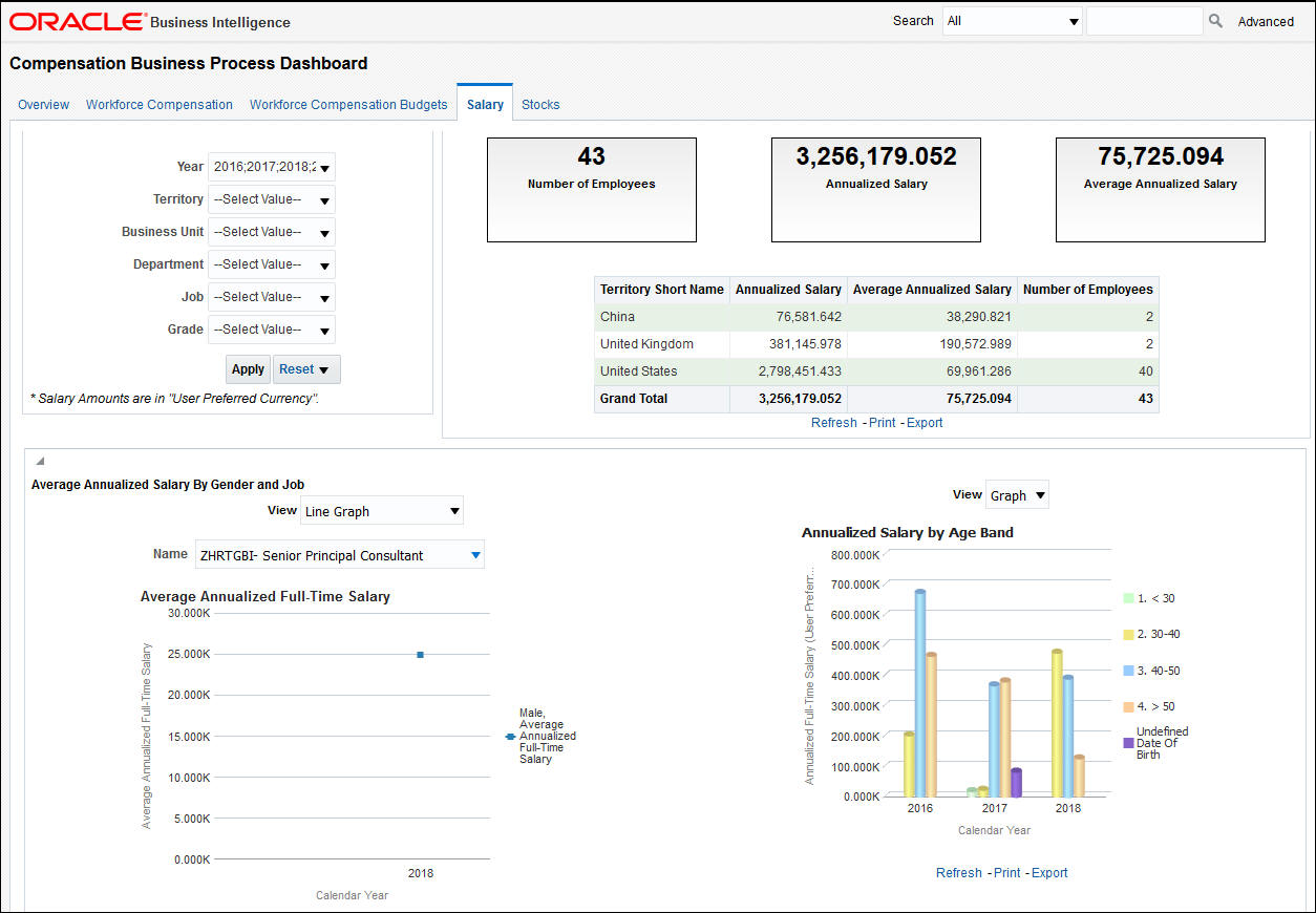 Improve your reporting on compensation business process with a new dashboard that aids compensation worksheet managers and analysts. Compensation Business Process Dashboard for Worksheet Manager, first provides an Overview tab of worker salary statistics by compa ratio, quartile, quintile, ethnicity; and shares granted. The details of the dashboard displays across four tabs, called Workforce Compensation, Workforce Compensation Budgets, Salary and Stocks.