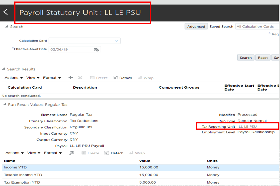 To assist with the reconciliation of your involuntary deduction calculations, new run results have been added to the CalculationInfo1 and CalculationInfo2 input values on the calculator shadow element. CalculationInfo1 shows information related to total owed balances, calculation rules, multiples allowed rule, the not allowed rule, and for federal tax levies, information for the deductions at time-of-writ calculations. If the information exceeds the character count, the remainder appears in CalculationInfo2.