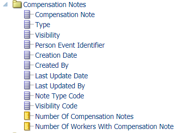NOTE: While creating analyses using attributes from these two dimensions in conjunction with attributes from other dimensions like Compensation Budget Pools or Compensation Components you must add a metric from either or both of these two folders and a metric from the Compensation Components and Rewards Fact folder.