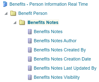 A new sub folder called "Benefits Notes" is added to the "Benefits Person Information Real Time" Subject Area under "Benefit Person" folder.