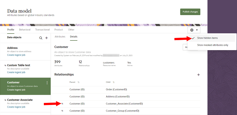 Foreign key relationships that use hidden data objects and attributes are no longer displayed by default on the Data model page. You can view hidden foreign key relationships by selecting the option to view hidden items.