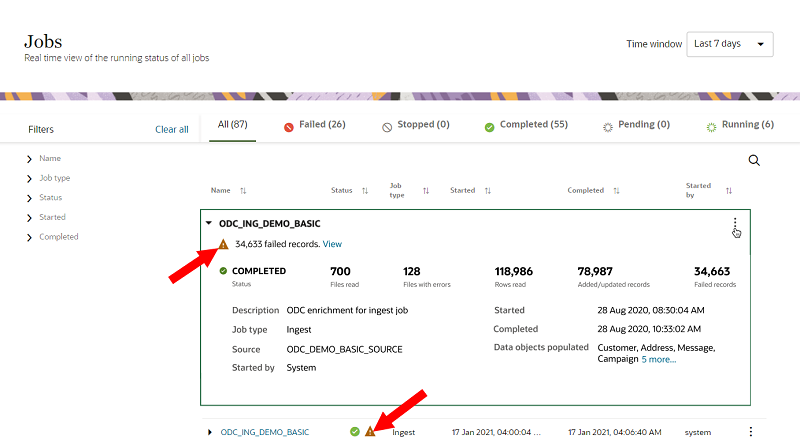 You can quickly identify ingest jobs that successfully completed but still had failed records, allowing you to take appropriate action to resolve issues.