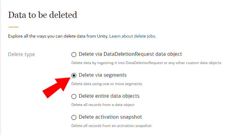 You can use the Oracle Unity platform to delete data records from existing segments by creating a data deletion job. The deletion job will delete data based on the segment criteria.