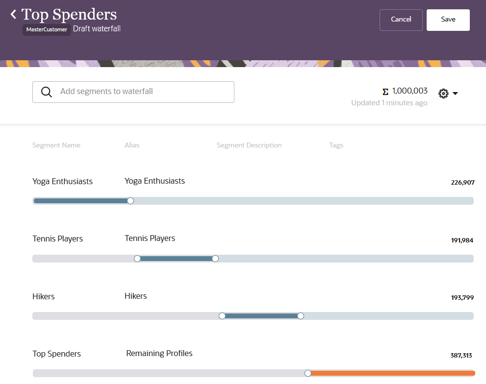 Waterfall segmentation is a new way to categorize the customers in your segments based on logic you have already defined in other segments. Each customer in the primary segment (e.g., "Top Spenders") will be categorized into a sub-segment (e.g., "Yoga Enthusiasts", "Hikers") based on the priority order you specify, and labels for these sub-segments will be included in the output you send to external systems like Oracle Responsys.