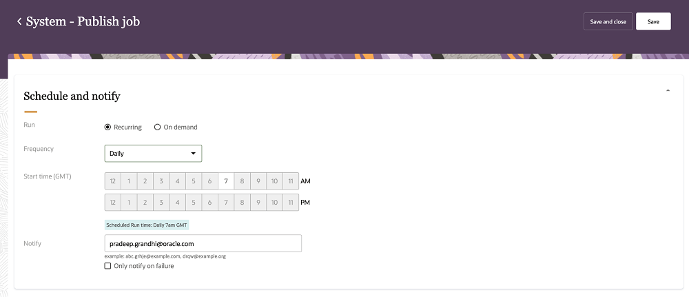 You can now specify whether publish jobs should be recurring or on demand, and as with other jobs, you can specify an email for notification on success and failure.