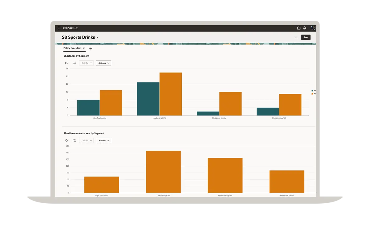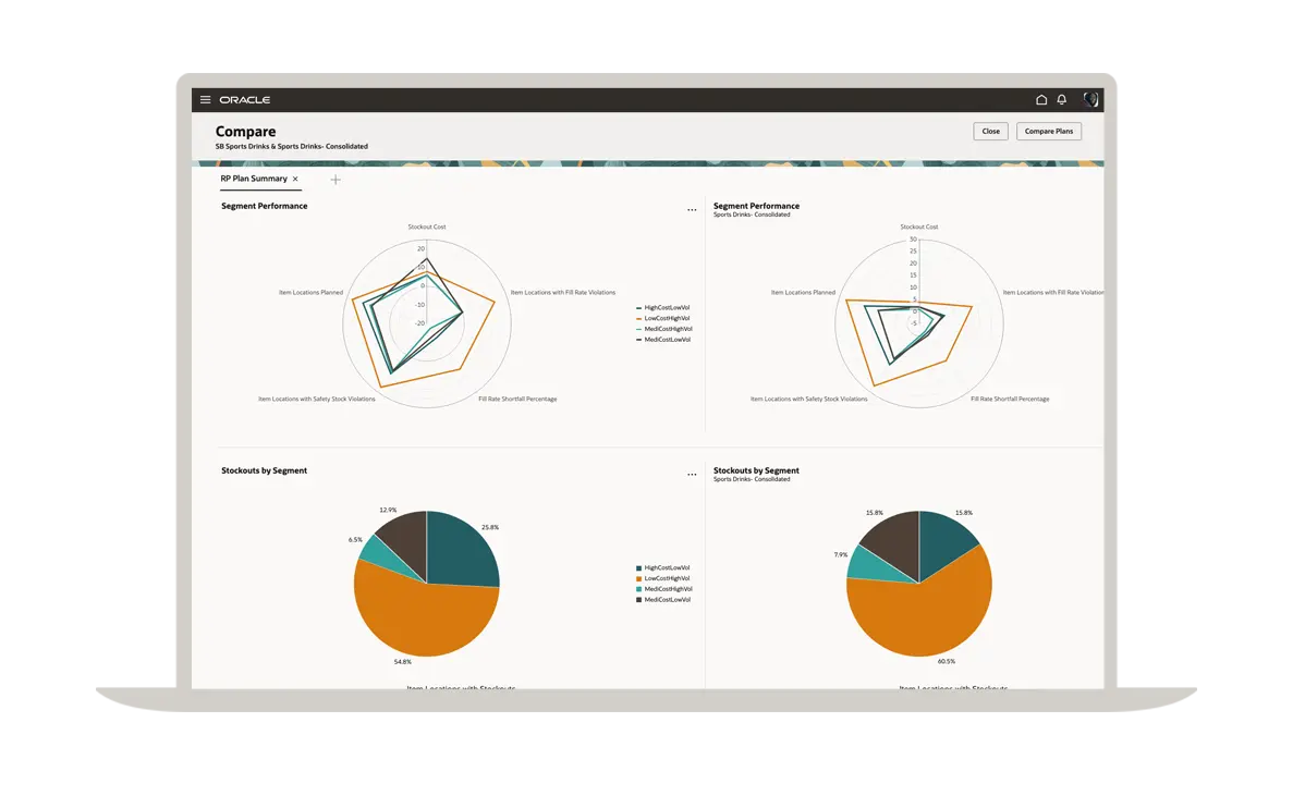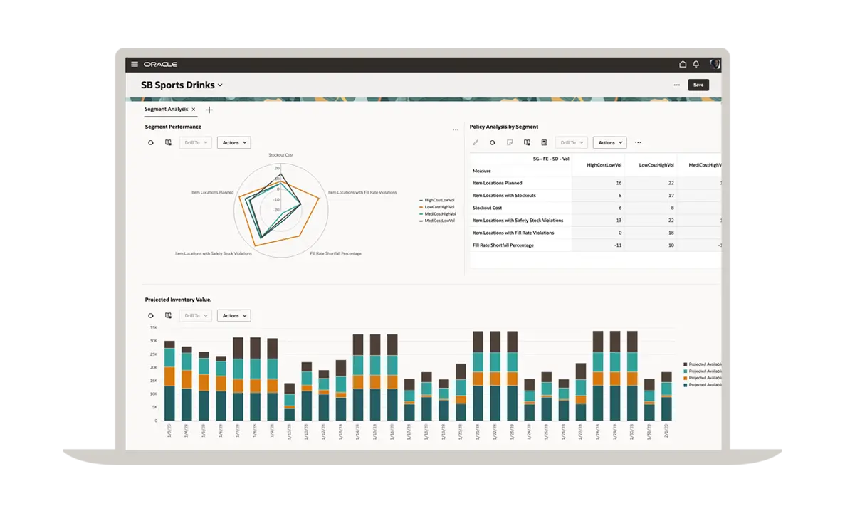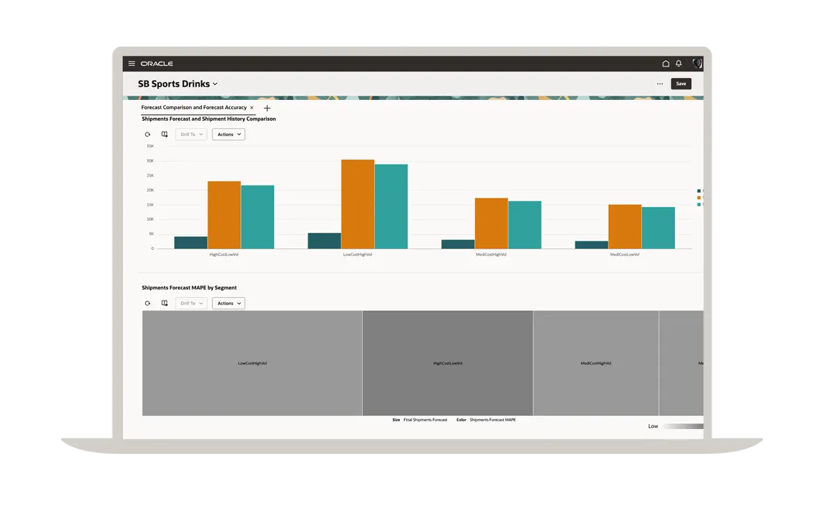 Un plan de réapprovisionnement efficace commence par une prévision précise de la demande. Grâce à Oracle Demand Management, vous bénéficiez des fonctionnalités d'une solution de planification de la demande de premier ordre qui vous permet de gérer facilement les lancements de nouveaux articles, les produits à faible volume, la saisonnalité et les événements ponctuels. Vous pouvez voir ici une comparaison des prévisions d'expédition avec l'historique des expéditions dans différents segments.