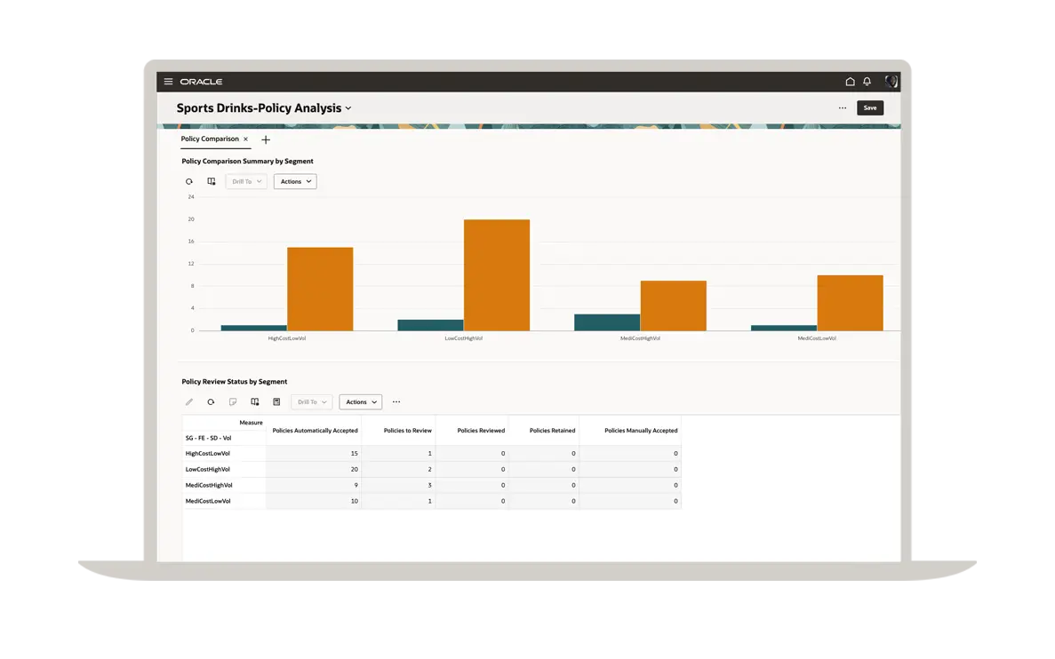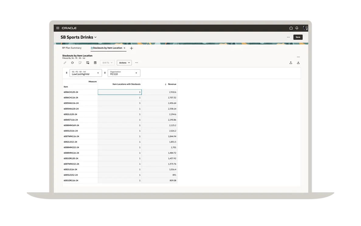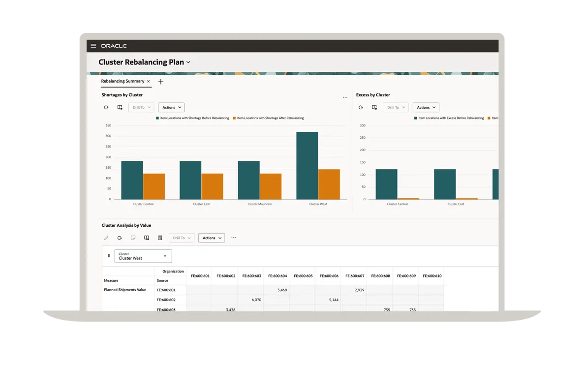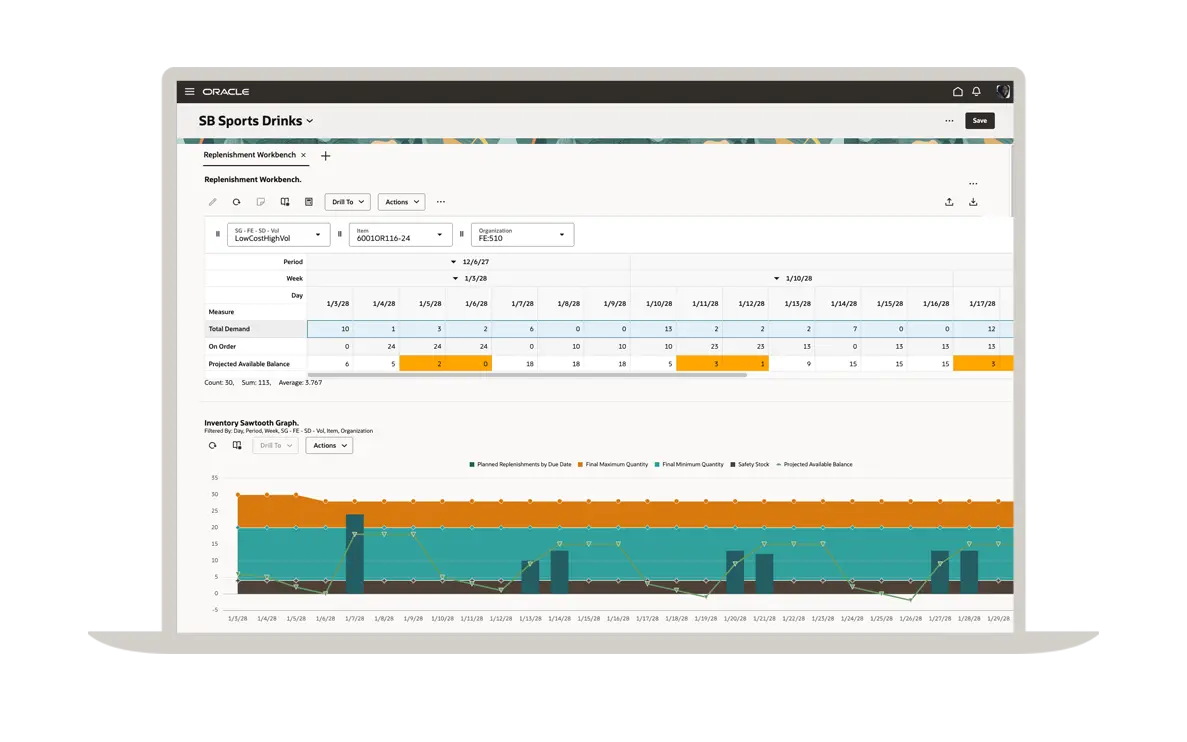Un plan de réapprovisionnement efficace commence par une prévision précise de la demande. Grâce à Oracle Demand Management, vous bénéficiez des fonctionnalités d'une solution de planification de la demande de premier ordre qui vous permet de gérer facilement les lancements de nouveaux articles, les produits à faible volume, la saisonnalité et les événements ponctuels. Vous pouvez voir ici une comparaison des prévisions d'expédition avec l'historique des expéditions dans différents segments.