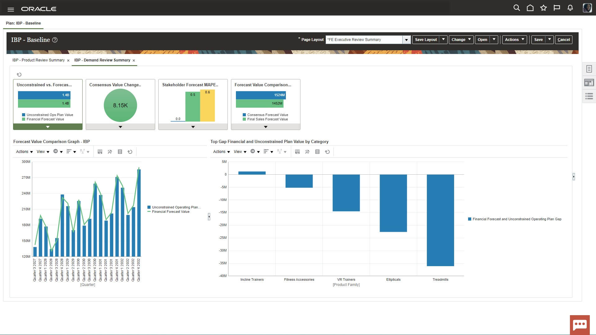 Use Demand Review to compare the operational forecast with updated financial, sales, and marketing forecasts from Oracle EPM and other sources. Analyze product forecasts to build stakeholder consensus on the future demand plan, which Oracle Fusion Cloud Demand Management and Oracle Fusion Cloud Supply Planning can leverage for tactical planning.