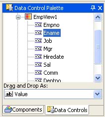 Notice the Data Control Palette has both a tree of items representing our middle-tier data along with a dropdown list with a set of "Drag and Drop As" options. Let's use the default, "Read-Only Table" and drag and drop "EmpView1" onto the JSP page.