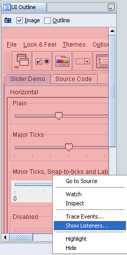 This is the time to get the UI Debugger into action. Without closing the running application, switch to the JDeveloper window. In the UI Outline debugger window in JDeveloper click the little camera icon to take a snapshot of your application. In the snapshot click the "Minor Ticks" slider to focus on it, you want to find out who is listening on events from this object. Right click the slider and choose "show listeners".