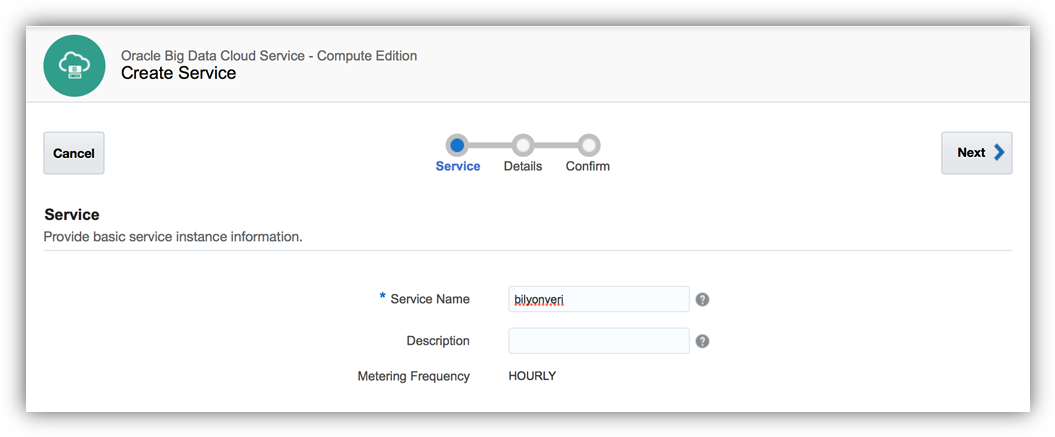 Quando clicamos em “Create Service” e selecionamos “Big Data – Compute Edition”, somos direcionados à página do serviço “Oracle Big Data Cloud”. Nesta página, podemos clicar em “Create Service” para executar um assistente muito simples, que possui apenas 3 passos, para criar nosso cluster big data.