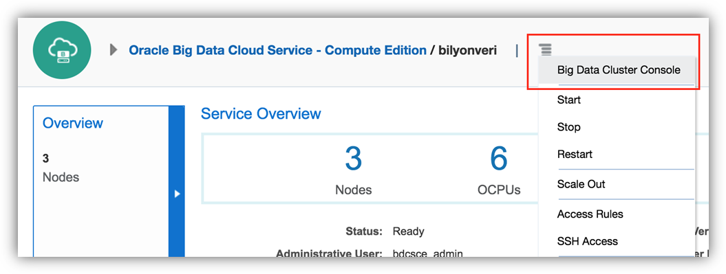 Quando estiver criado, podemos consultar o status geral do serviço clicando no nome do mesmo. Esta página também nos permite parar e reiniciar o serviço, definir permissões de acesso e acessar o console do Oracle Big Data Cluster.