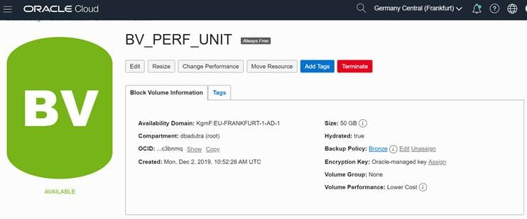 Balanced: Esta é a configuração padrão para novos block volumes e boot volumes e também que já existem. Ele fornece um bom equilíbrio entre desempenho e economia de custos para a maioria das cargas de trabalho, incluindo aqueles que executam I/O aleatórios tais como boot volumes. Esta opção proporciona dimensionamento linear de peformance com 60 IOPS/GB até 25.000 IOPS por volume.Throughtput scales de 480 KBPS/GB até um máximo de 480 MBPS por volume. Com esta opção, você está comprando 10 VPUs por GB/mês.
