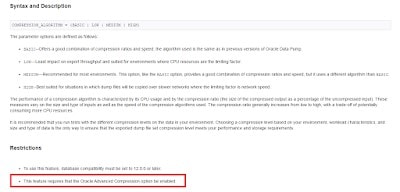 Quando li nos docs oficiais da Oracle que foi criada uma opção de compressão com o nome BASIC, imaginei que ela pudesse ser gratuita (sem a necessidade de pagar pelo uso de uma option adicional) para uso no Oracle Database, visto que, já existem opções de compressão com o nome BASIC no nível de tabelas e também no nível de backups, e ambas não exigem licenciamento adicional da option "Advanced Compression". Pesquisei nos docs oficiais da option "Advanced Compression" no Oracle 12cR2 e não encontrei informações muito esclarecedoras sobre as questões de uso da compressão BASIC no Data Pump e a necessidade de licenciamento da referida option, mas isso ficou mais claro quando encontrei o link https://docs.oracle.com/database/121/SUTIL/GUID-F81B5F5F-9F40-4EB0-99B8-47C45179DE5E.htm#SUTIL4051 contendo informações sobre o uso do parâmetro COMPRESSION_ALGORITHM e a seguinte frase: "This feature requires that the Oracle Advanced Compression option be enabled" (ver Imagem 01).