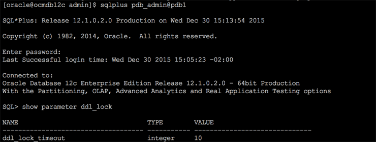 A persistência dos parâmetros no CDB e PDB possuem as mesmas implicações de antes. Os parâmetros estáticos só terão efeito se você reiniciar o banco de dados enquanto parâmetros dinâmicos entrarão em vigor imediatamente. Além disso, se você desplugar um PDB e depois replugar em outro CDB, os parâmetros alterados serão transferidos também. Uma observação importante, é que ao utilizar CONTAINER=ALL na alteração do parâmetro no CDB, o valor desse parâmetro também será alterado em todos os PDBs, mesmo que ele já tenha sido alterado no PDB.