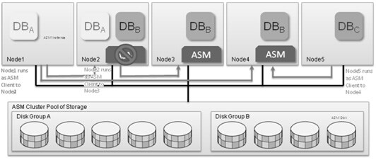 - A instancia de ASM na versão 12c será executada em cada node dentro da configuração Flex para servir as instancias de base de dados em uma versão anterior a 12c. a vantagem desta configuração é que se uma instancia de uma base de dados perde a conectividade com uma instancia ASM, então as conexões de banco de dados realizam “failover” com outra instancia ASM em um node diferente.