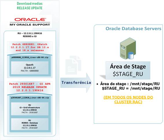 Após completar as etapas descritas nos parágrafos anteriores, é necessário transferir os binários referente aos PATCHs para a área de stage ($STAGE_RU), que no contexto deste artigo trata-se do diretório /mnt/stage/RU (caso você tenha elegido um caminho diferente ao exemplificado neste artigo, ajuste ao seu cenário).