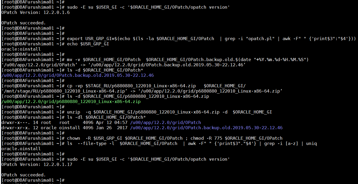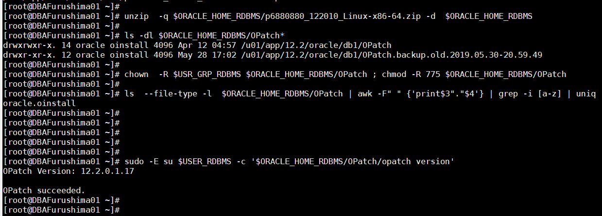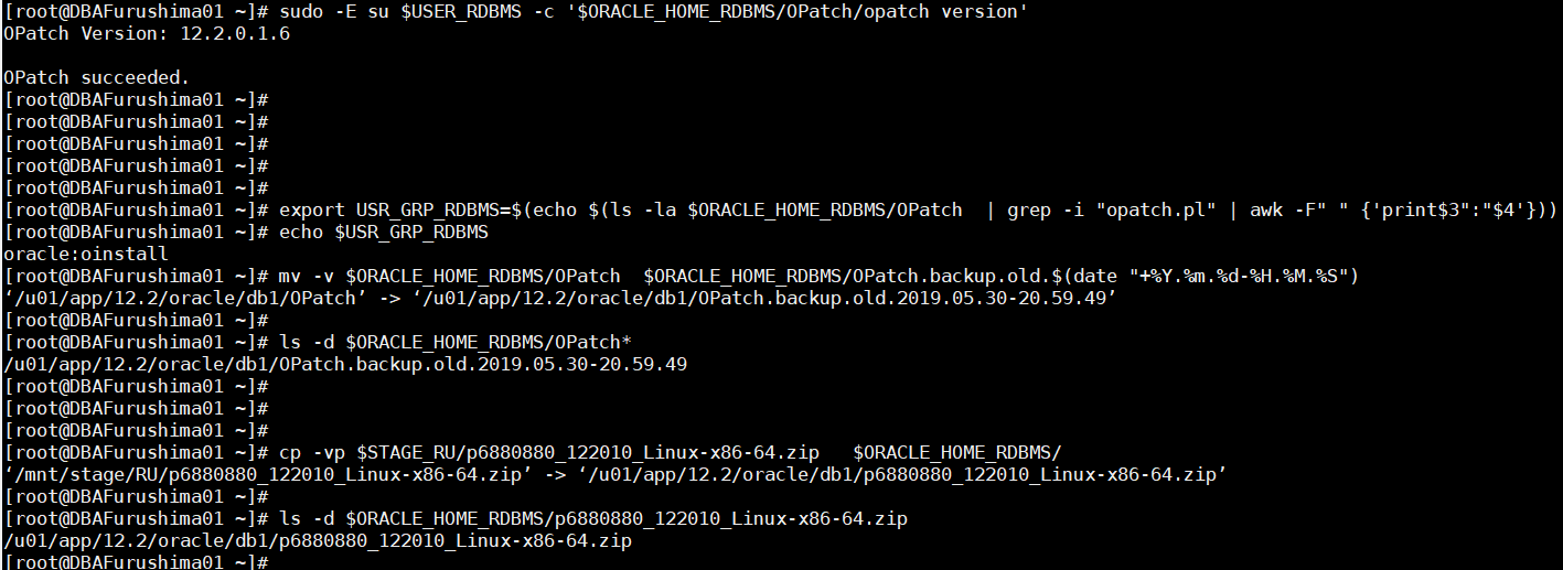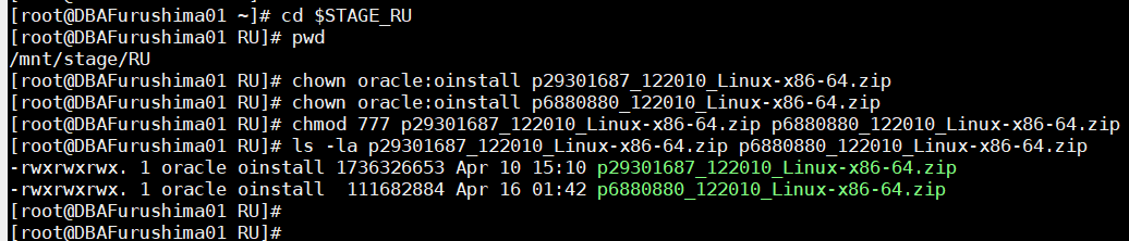 [root@DBAFurushima1 RU]# chown oracle:oinstall p6880880_122010_Linux-x86-64.zip