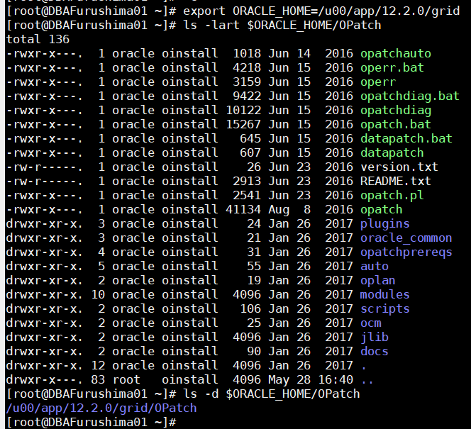 [root@DBAFurushima01 ~]# ls --file-type -l $ORACLE_HOME_GI/OPatch | awk -F" "