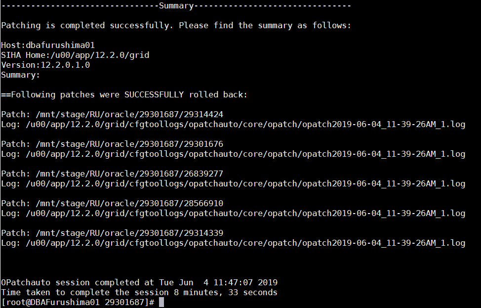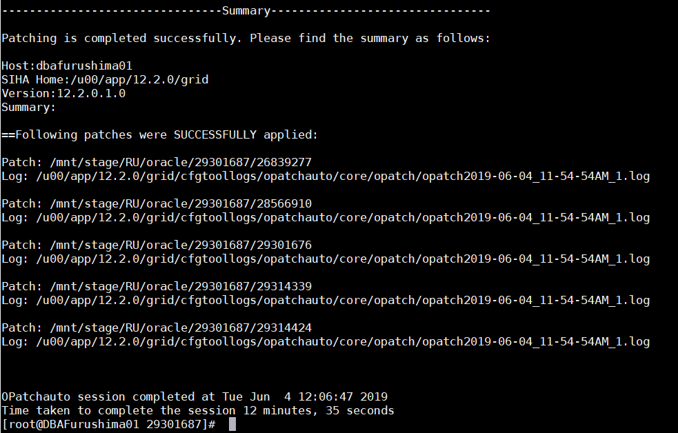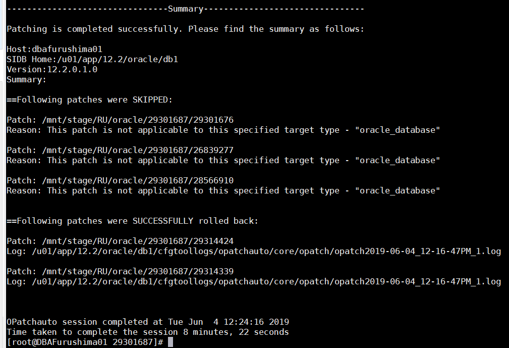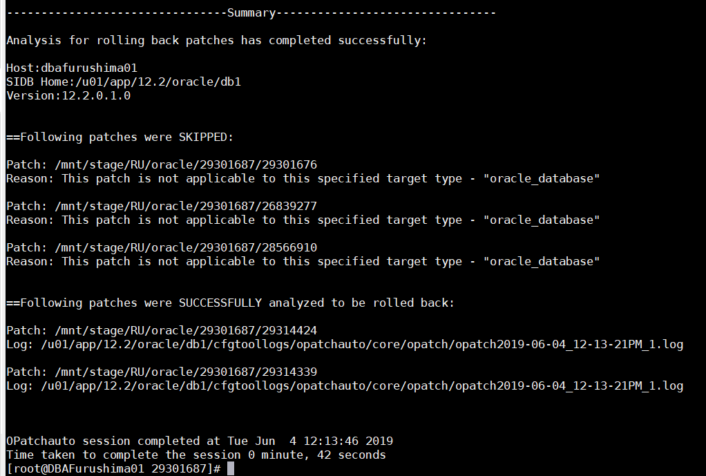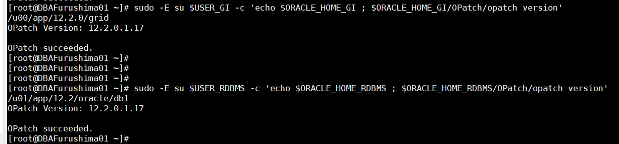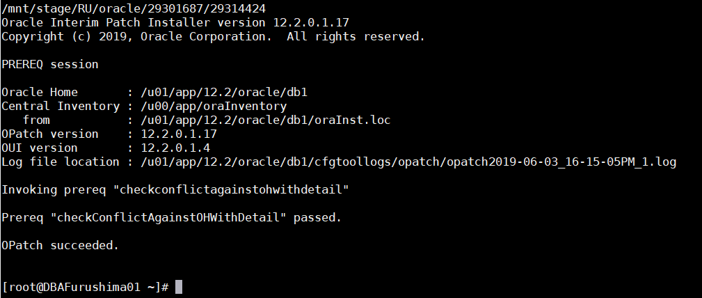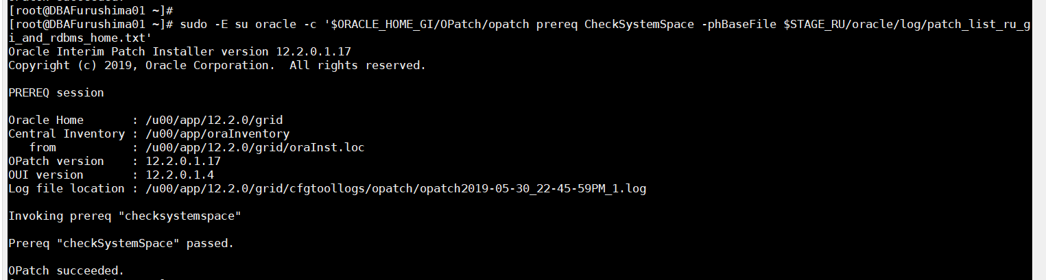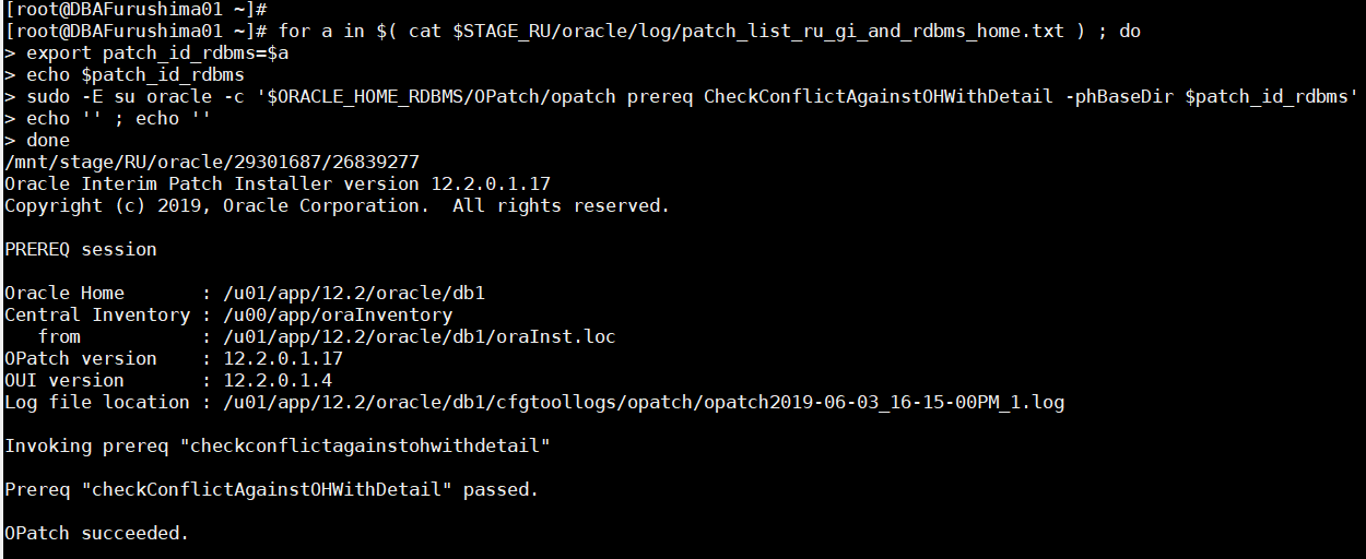 [root@DBAFurushima01 ~]# sudo -E su oracle -c '$ORACLE_HOME_RDBMS/OPatch/opatch prereq