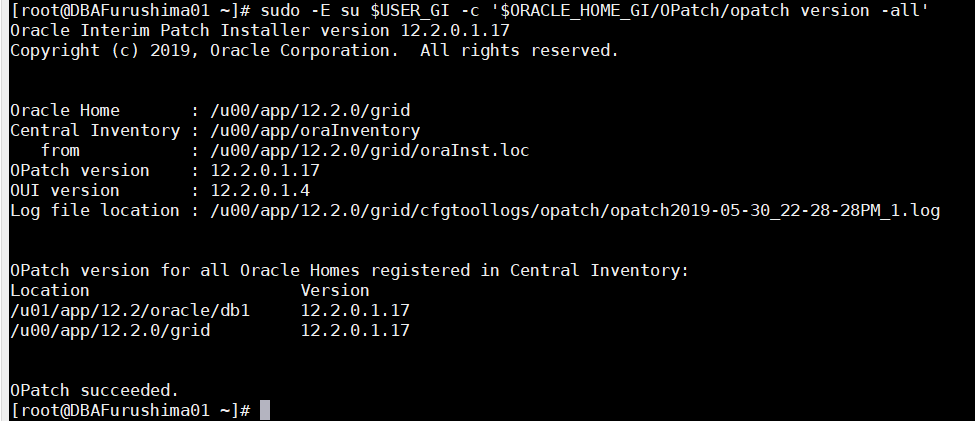 [root@DBAFurushima01 ~]# sudo -E su oracle -c '$ORACLE_HOME_GI/OPatch/opatch prereq