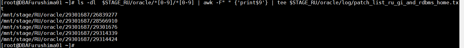 [root@DBAFurushima01 ~]# ls -dl $STAGE_RU/oracle/*[0-9]/*[0-9] | awk -F" " {'print$9'} |