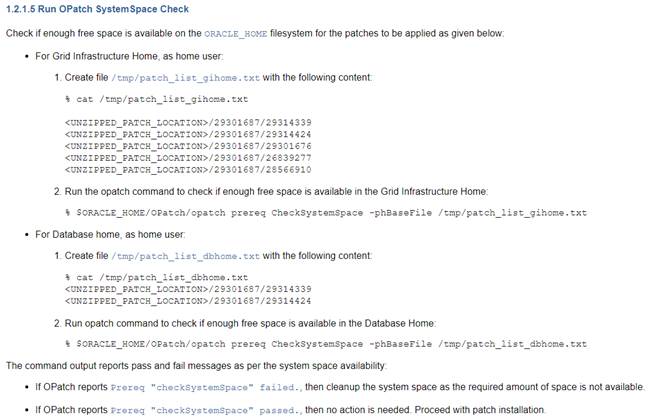 CheckSystemSpace -phBaseFile $STAGE_RU/oracle/log/patch_list_ru_gi_and_rdbms_home.txt'