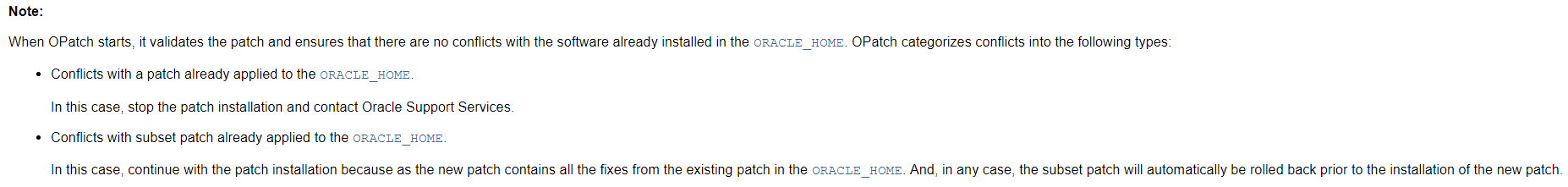 É importante citar que o termo "patch" ou "patches" (referindo o sujeito no plural), neste contexto refere-se de forma genérica (ou global) aos diversos tipos de arquivos que irão prover algum ou alguns tipo(os) de correção(cões) ao software oracle database (GI e/ou RDBMS), em outras palavras, "patch" ou "patches" trata-se de uma coleção de arquivos que ao serem submetidos ou aplicados (apply) via OPatch, são copiados para uma instalação existente, substituindo arquivos atuais ou tornando uma novo arquivo na instalação em caso do mesmo não existir previamente.