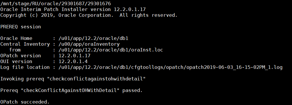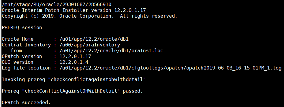 sudo -E su oracle -c '$ORACLE_HOME_RDBMS/OPatch/opatch prereq