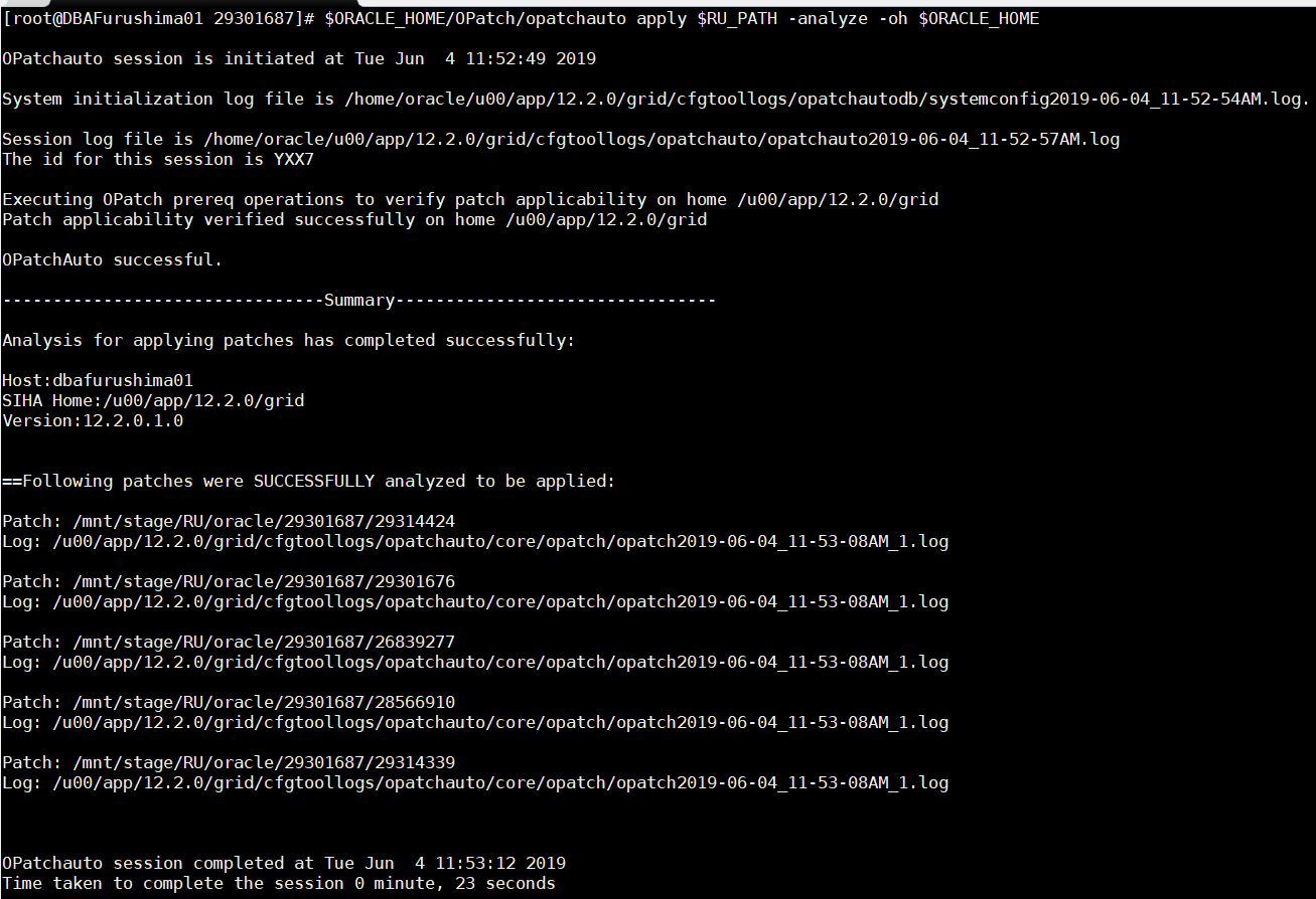 $ORACLE_HOME/OPatch/opatchauto apply $RU_PATH -analyze -oh $ORACLE_HOME