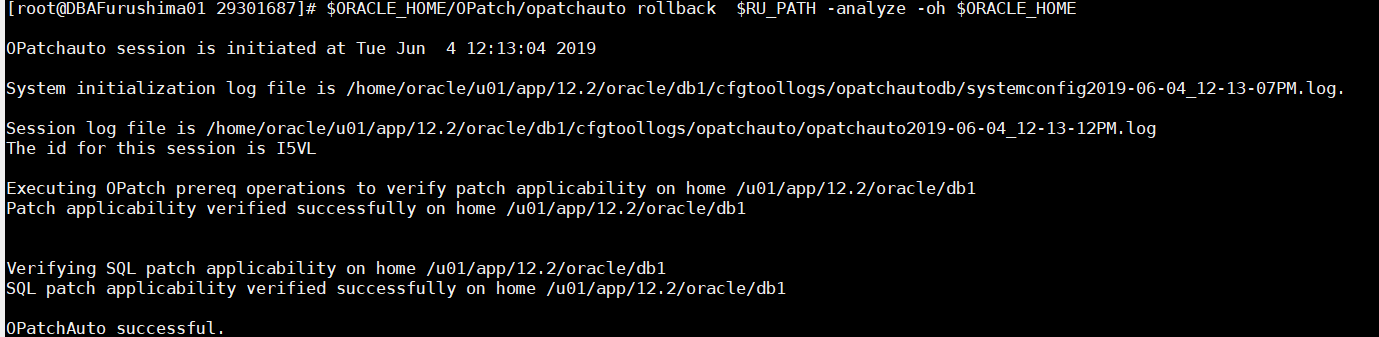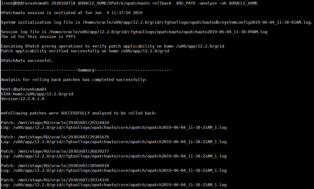 $ORACLE_HOME/OPatch/opatchauto rollback $RU_PATH -analyze -oh $ORACLE_HOME
