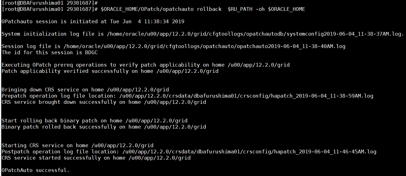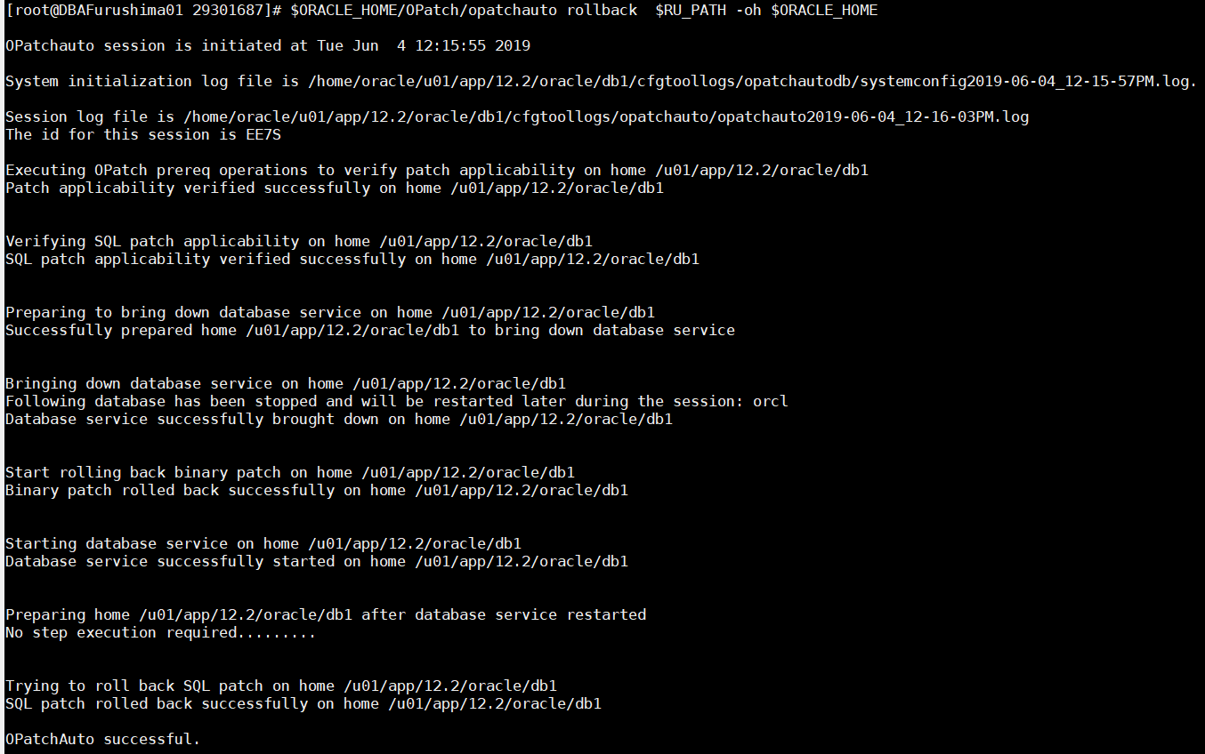 $ORACLE_HOME/OPatch/opatchauto rollback $RU_PATH -oh $ORACLE_HOME