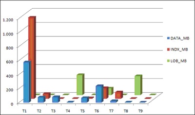 Através das informações retornadas pela query, vemos que o segmento de dados da tabela T1 possui um tamanho de 576 MB (em aproximadamente 6 milhões de linhas), e que os índices desta tabela somam 1160 MB dando um total de 1736 MB. Portanto, na minha visão, o tamanho real desta tabela é de 1736 MB, e não 576 MB como muitos poderão dizer. Lembrem-se de que eu não estou falando apenas do segmento de tabela (T1), mas de todos os outros que dependem dela, como segmentos de índice e de lob por exemplo.